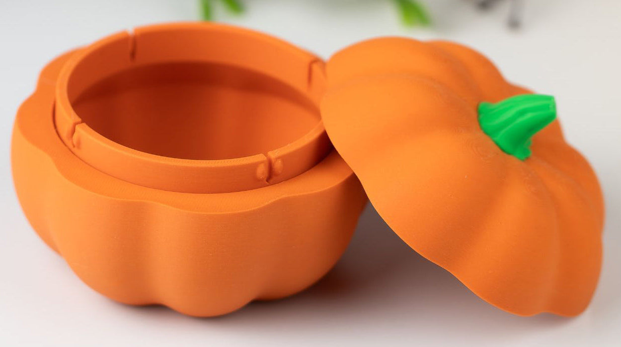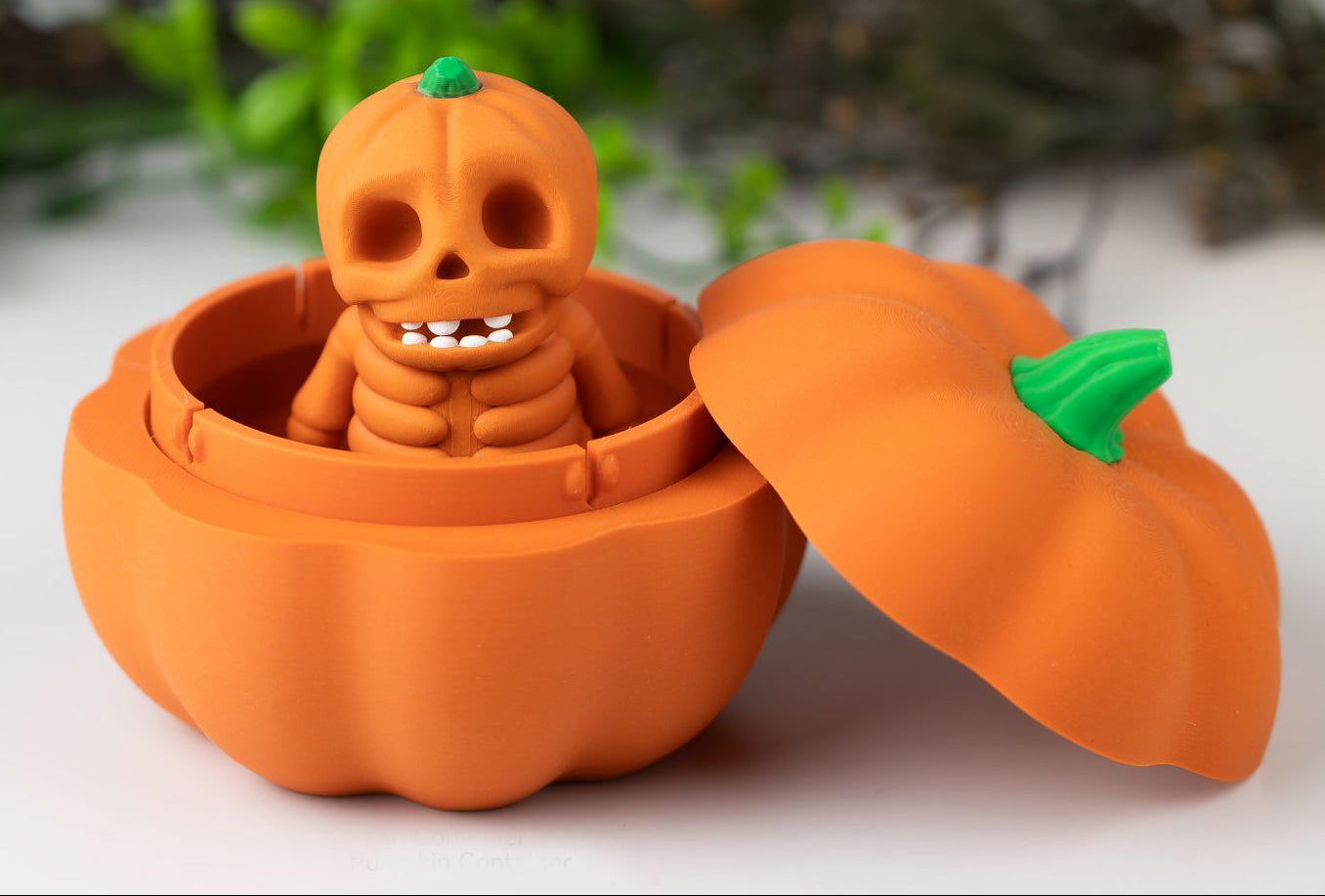 Bring a playful yet spooky touch to your seasonal décor with this 3D printed pumpkin container featuring a detailed skeleton figurine. Designed to capture the fun of Halloween, this decorative piece adds character to shelves, tables or mantel displays while embracing a festive autumn aesthetic.