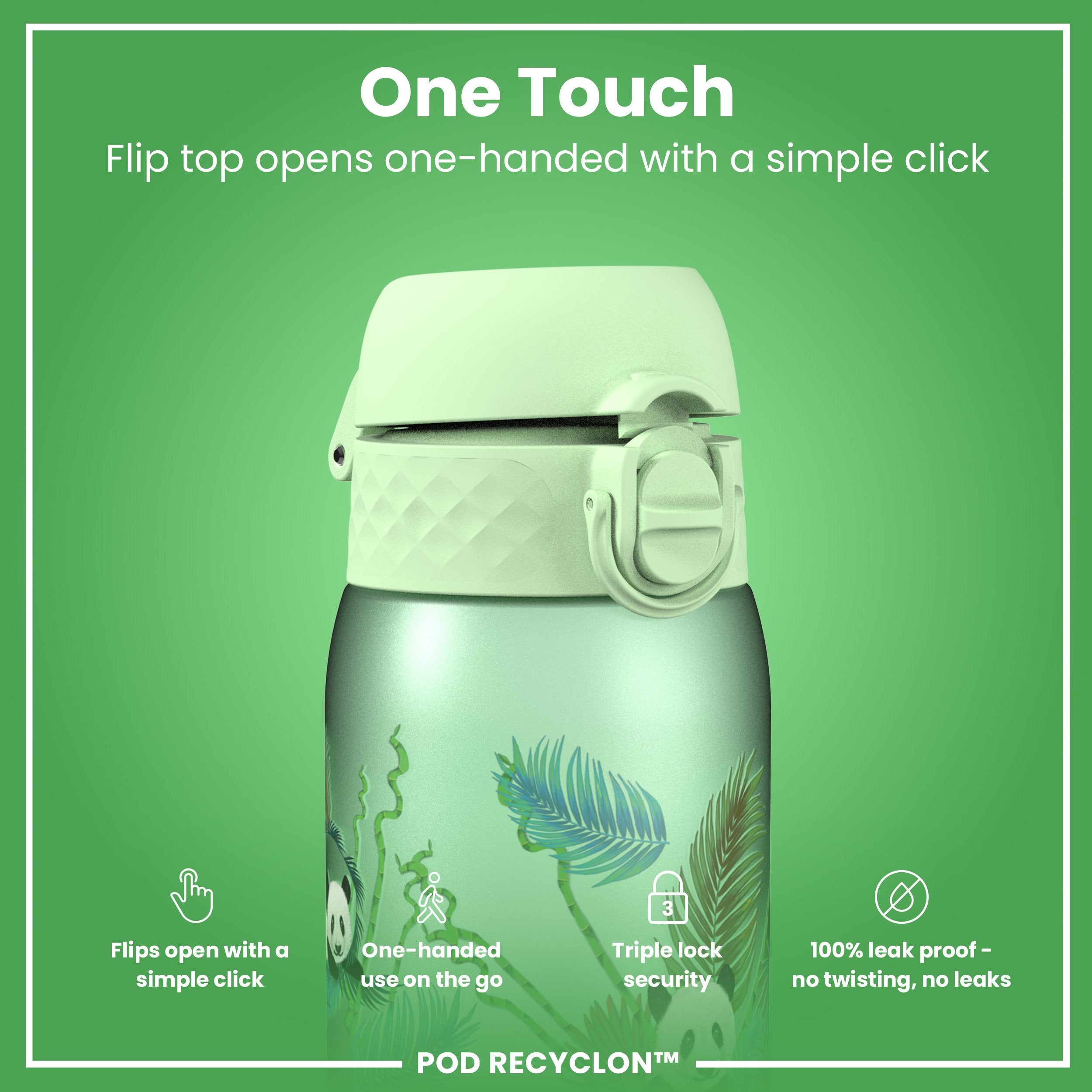 The Leak-Proof Kids Water Bottle – Recyclon Pandas (350ml / 12oz) is designed to make hydration fun and safe for children. Featuring an adorable panda design, this bottle is made from Recyclon™, a carbon-neutral, plant-based polymer that is BPA-free and dishwasher-safe. The leak-proof design ensures no spills, making it perfect for school, outings, or travel. With a 350ml capacity, it's the ideal size for young children to carry and use independently. The hygienic flip-top lid opens with a simple click, allowing for easy one-handed use.