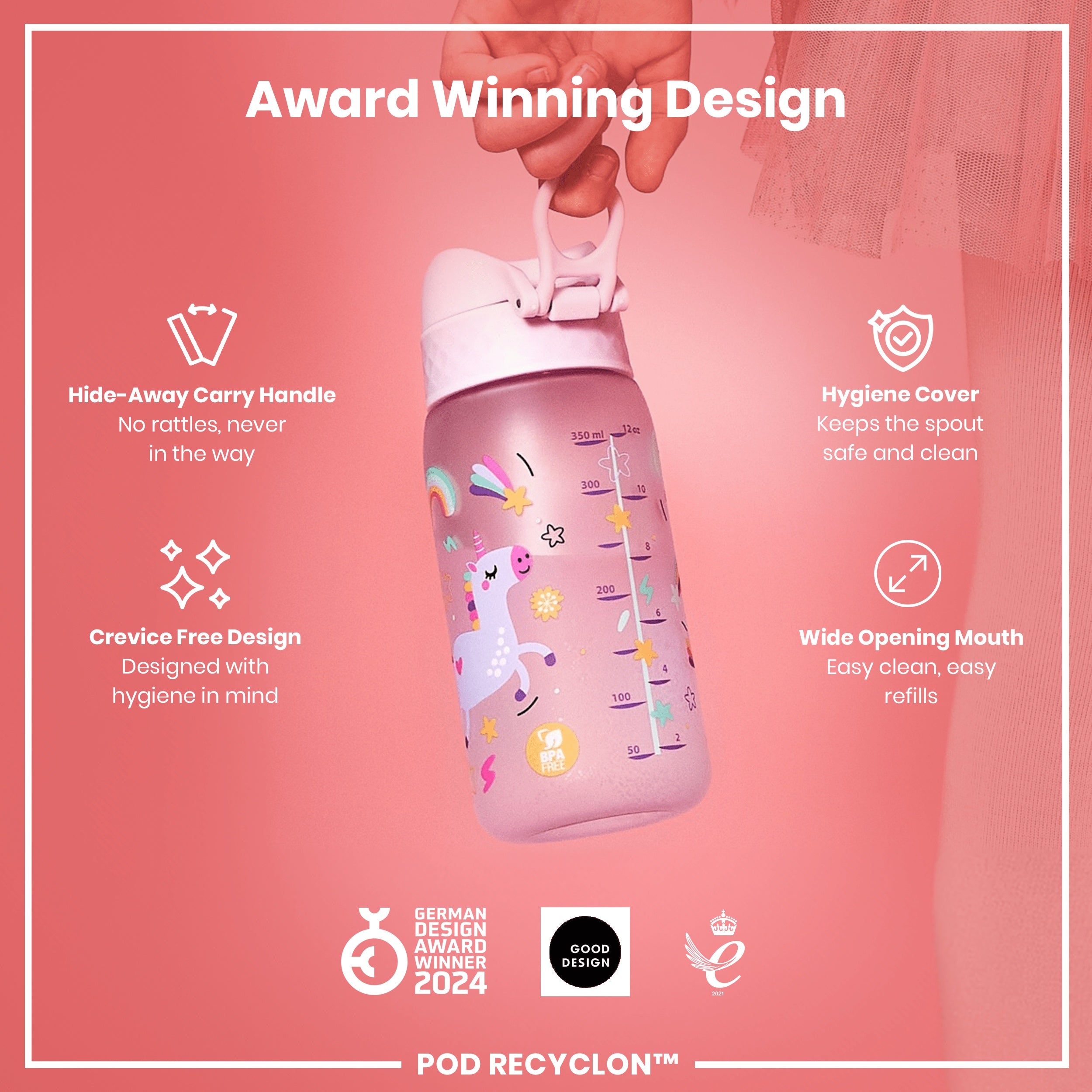 The Ion8 Leak-Proof Kids Water Bottle – Recyclon Unicorns 350ml (12oz) combines functionality, style, and sustainability. Crafted from Recyclon™, a transparent carbon-neutral plastic partly made from plants.
