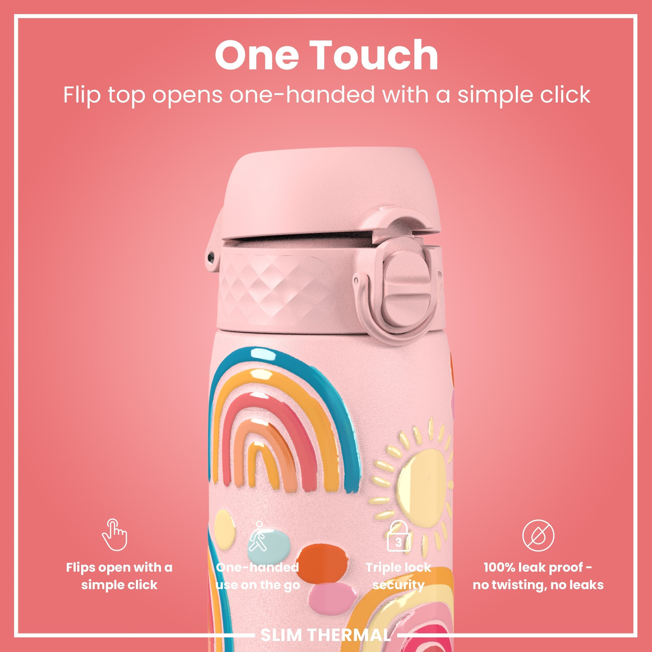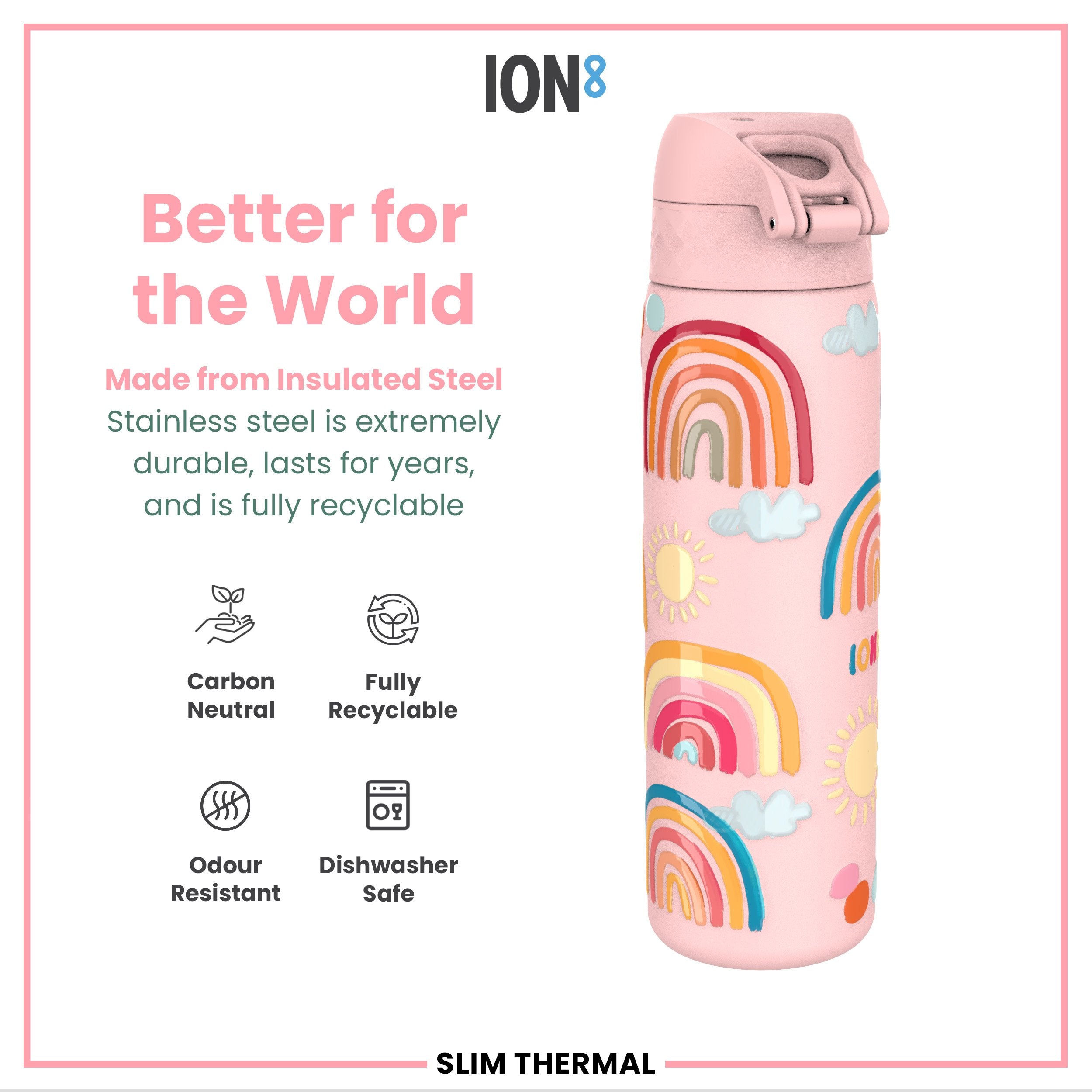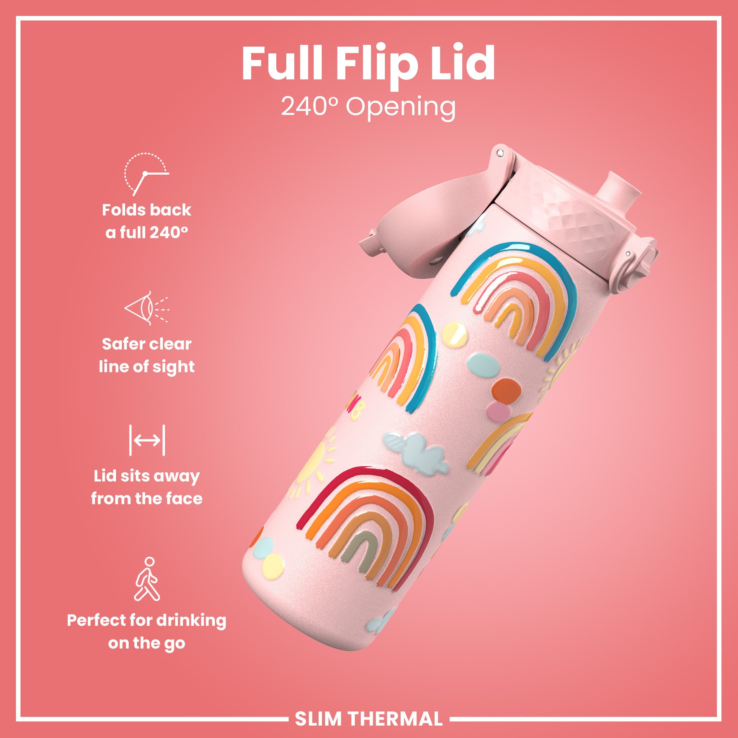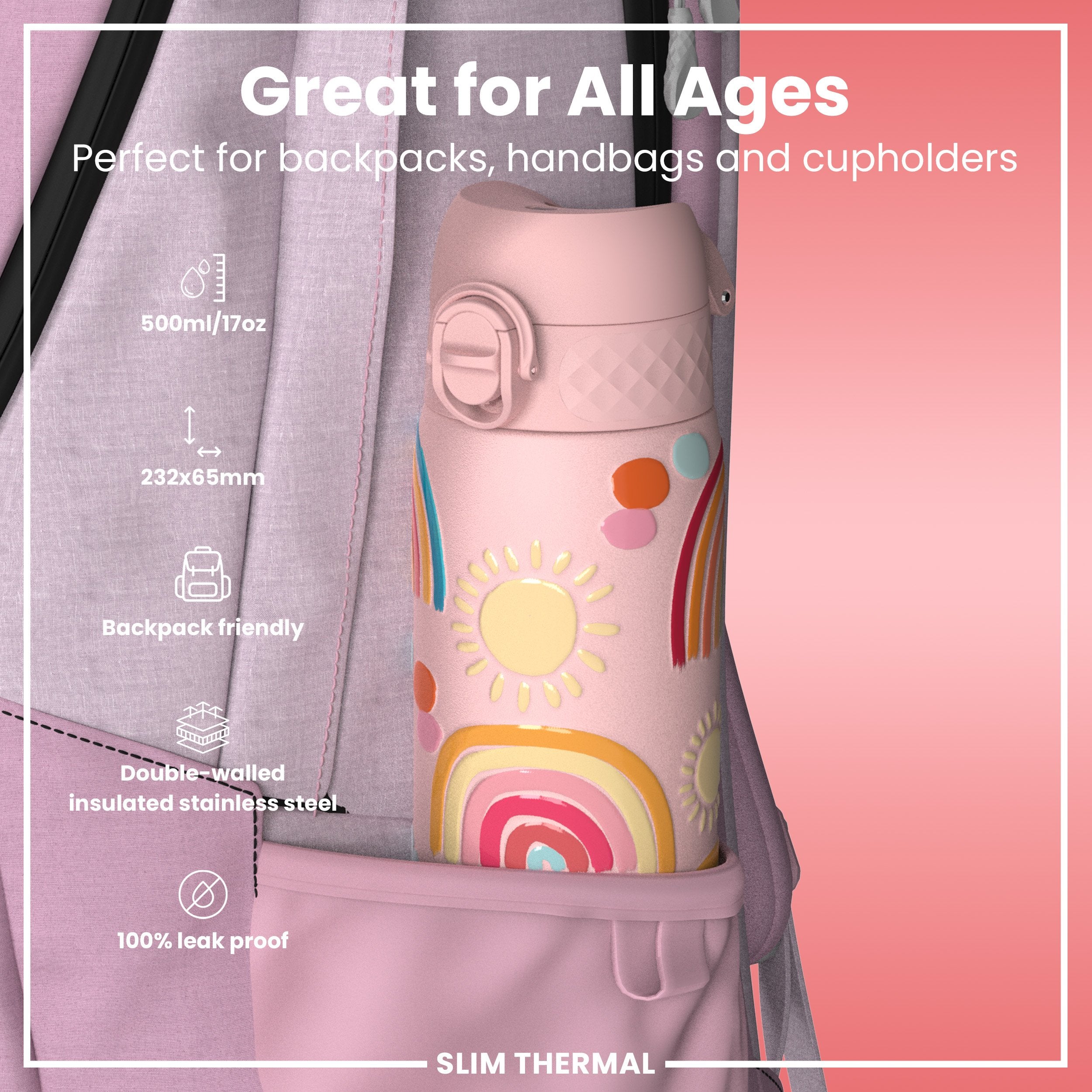 Leak Proof Slim Thermal Steel Water Bottle, Insulated, Rainbows, 500ml (17oz)