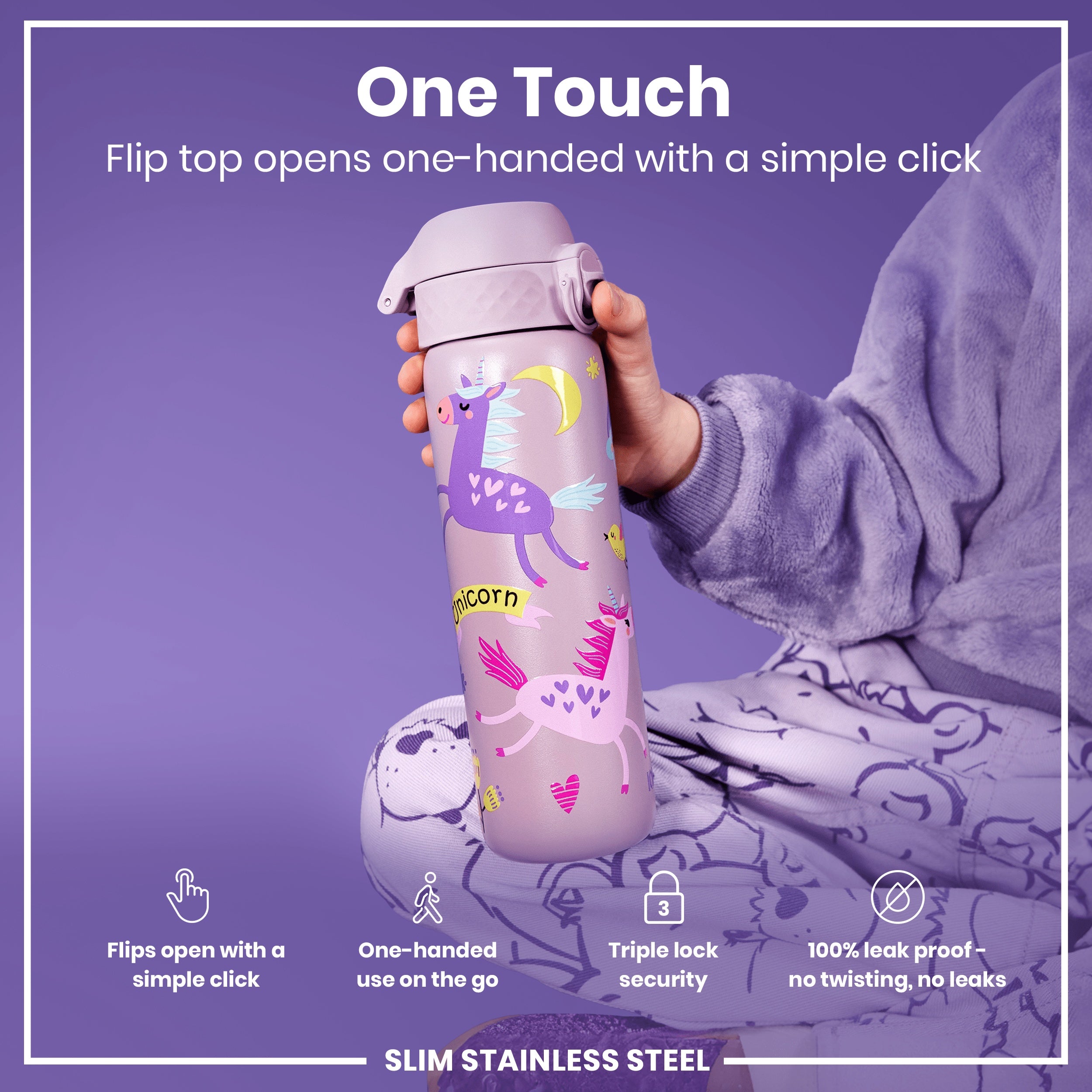 Leak Proof Slim Water Bottle, Stainless Steel, Unicorns, 600ml (20oz)