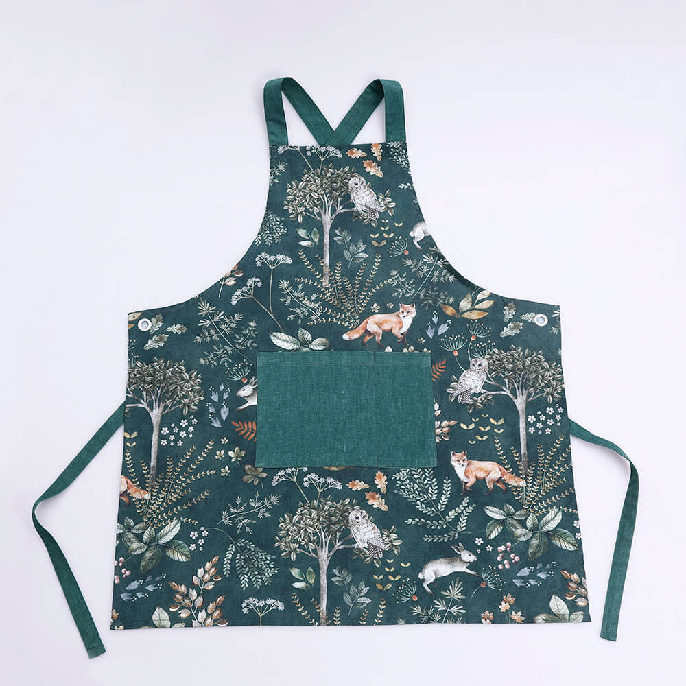 Introduce a touch of classic charm to your kitchen attire with the MM Living Briar Apron. The apron showcases a “small-scale classic design” featuring whimsical woodland motifs—creatures at play in a garden or arboretum.