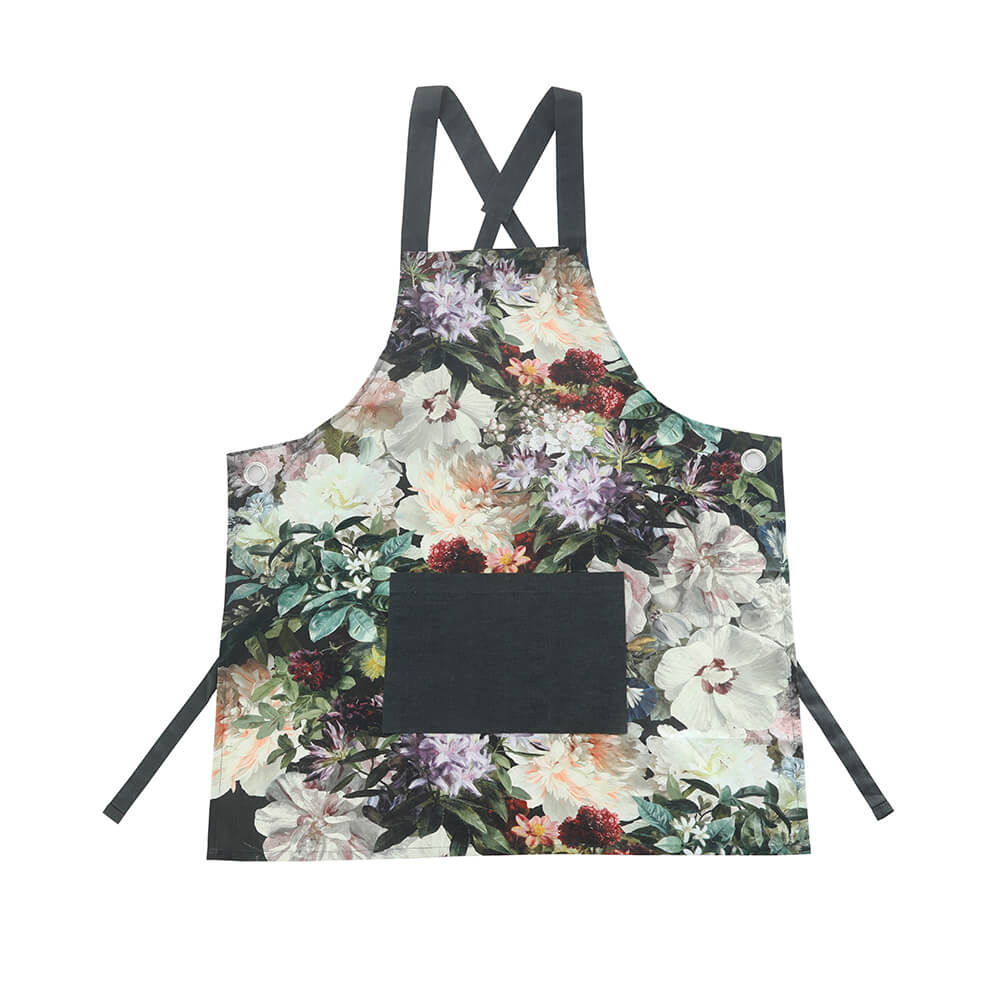 Bring a touch of dramatic botanical elegance to your kitchen attire with the MM Living Fiori Apron. Featuring the bold, richly colored Fiori floral print set against a deep background, this apron makes a statement while serving a functional role.