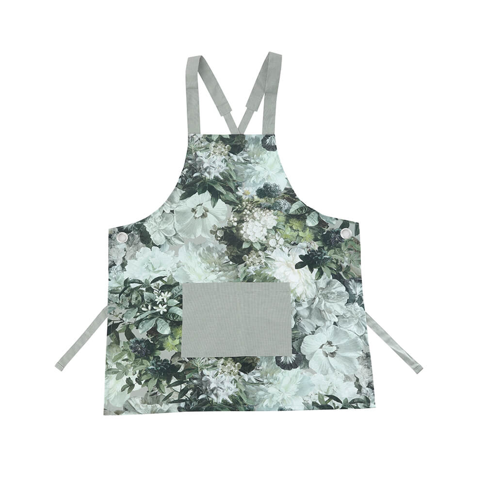 Cook, bake, garden or craft with flair in the MM Living Florian Apron, where form meets function in a luxurious botanical print. The apron is bedecked with rich green florals set against a deep, moody backdrop, giving it a dramatic yet elegant aesthetic.