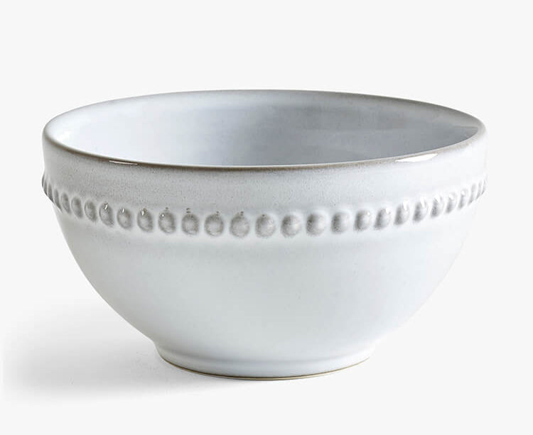 Enhance your dining experience with the MM Living Glacier Bobble Cereal Bowl. Crafted from high-quality stoneware, this bowl features a smooth, glossy glaze with intricate beaded edge detailing in a soft grey hue. Measuring 15 cm in diameter and 8 cm in height, it's ideal for serving cereal, soups, or salads. Each piece is hand-glazed, ensuring a unique and translucent finish. Sourced from Portugal, this bowl combines functionality with elegance, making it a perfect addition to your tableware collection.