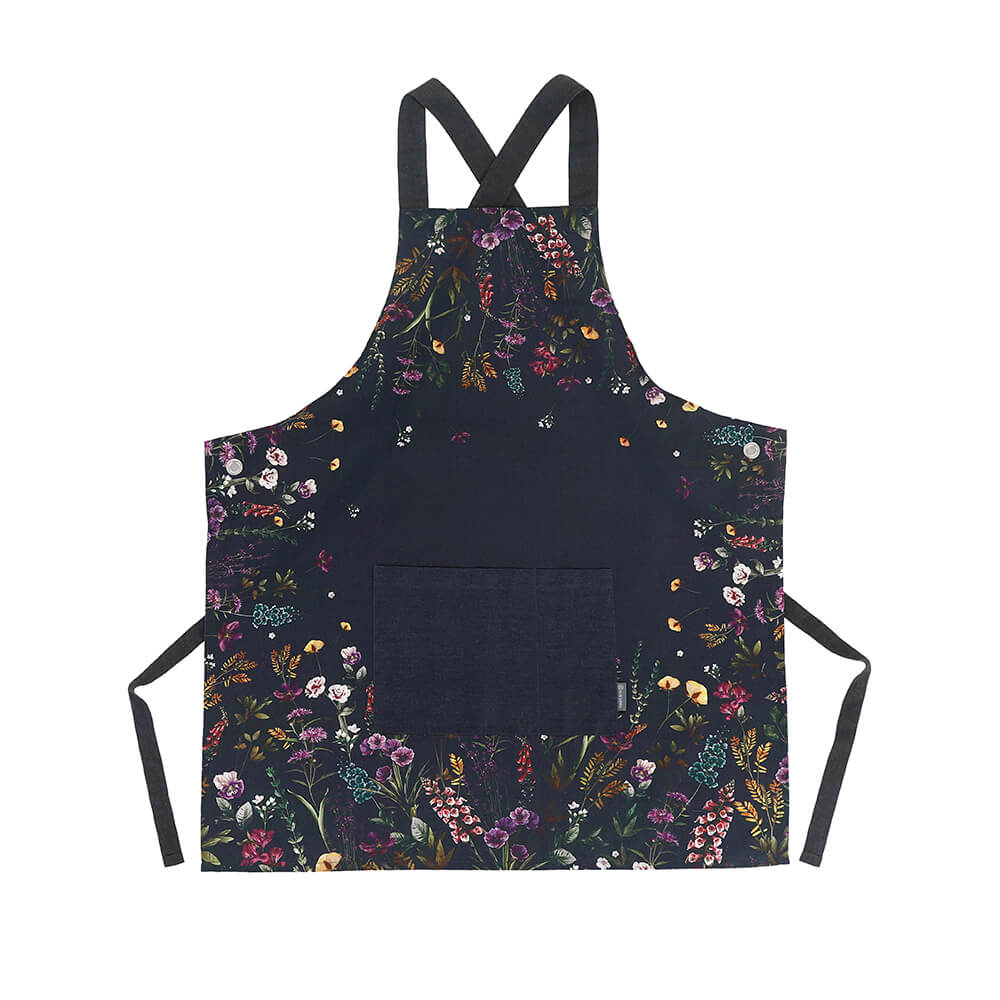 Add a touch of botanical elegance to your kitchen attire with the MM Living Maisie Apron. Inspired by the vibrant spring colors of the Christchurch Botanic Gardens, this apron features a bright and delicate floral design set against a dark background, bringing a burst of color and sophistication to your cooking routine.