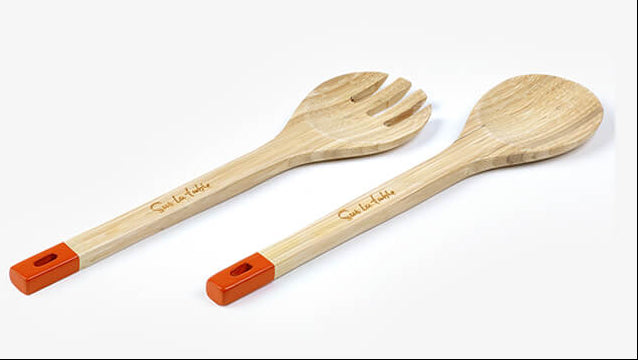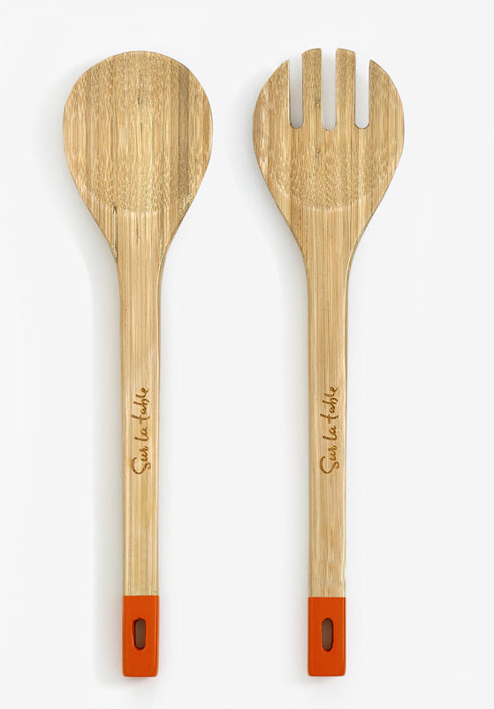 Enhance your table setting with the Sur La Table Bamboo Salad Spoons. This two-piece set combines the natural elegance of bamboo with a pop of vibrant orange at the handles, adding a touch of sophistication to any meal.
