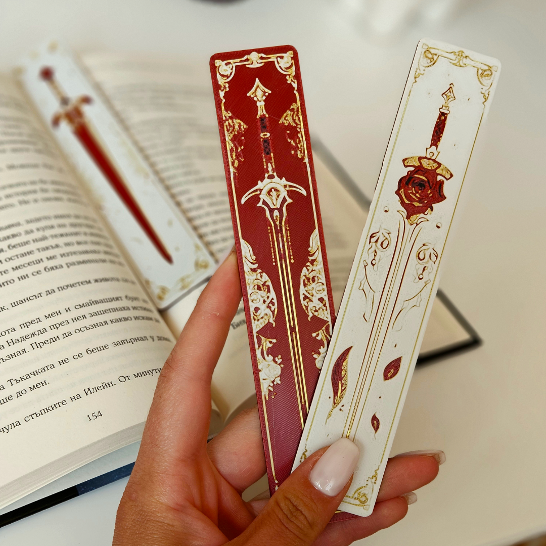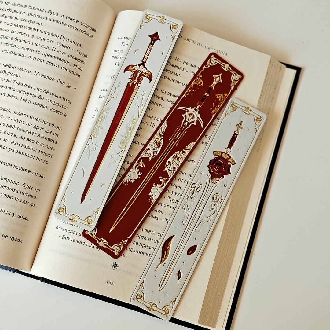 This enchanting 3-piece collection features intricate sword designs paired with delicate floral motifs in striking red, white, and gold. Each bookmark symbolises courage and beauty, making them the perfect companion for your epic reads.
