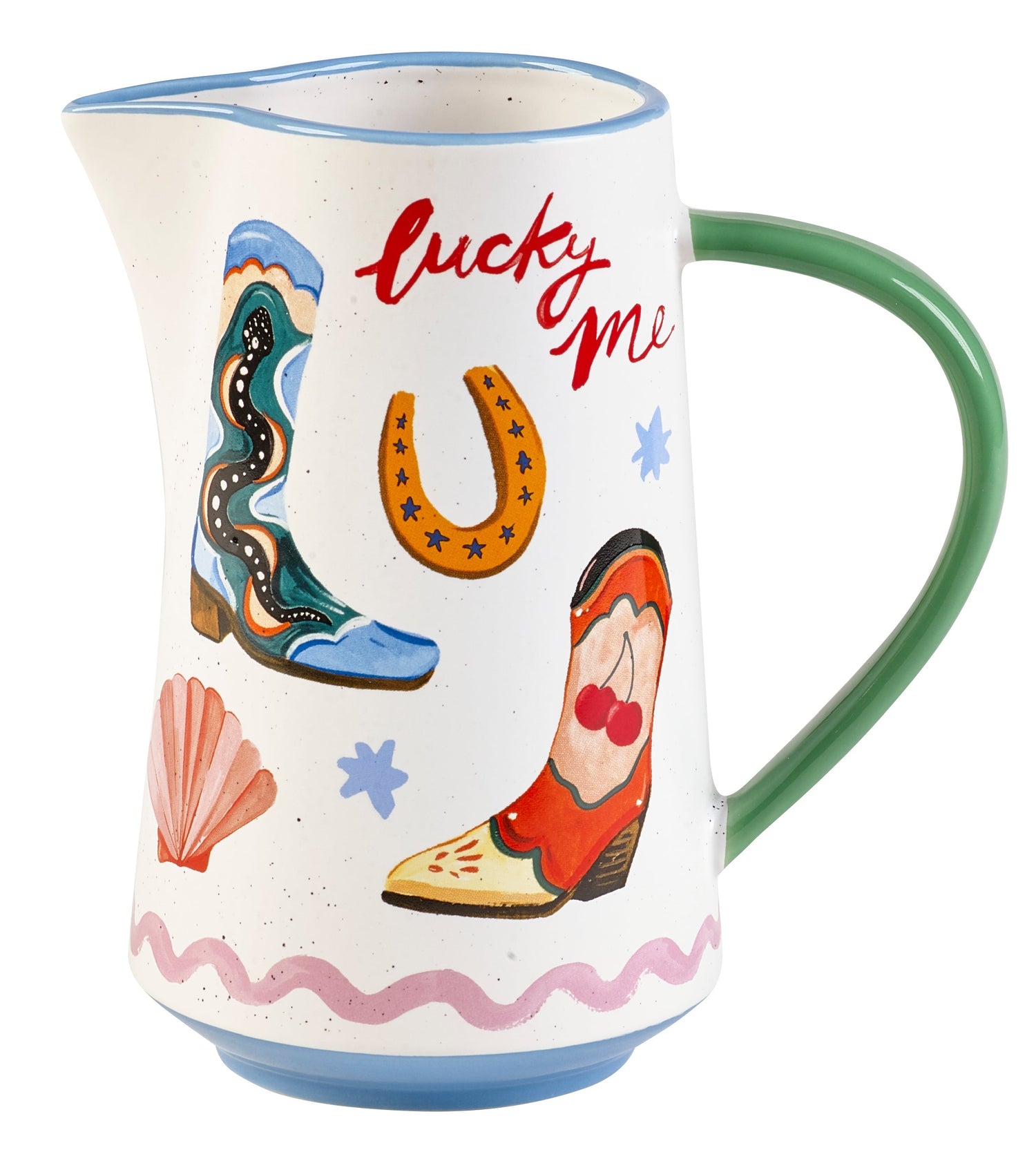 Add a touch of playful elegance to your table with the Eleanor Bowmer Electric Coast Large Jug. Crafted from sturdy stoneware with a soft speckled glaze, this jug features Eleanor Bowmer's signature hand-illustrated icons, including cowboy boots, suns, dice, and a cheeky 'Lucky Me' slogan. With an 850ml capacity, it's perfect for serving your favorite beverages or displaying a beautiful spring bouquet.