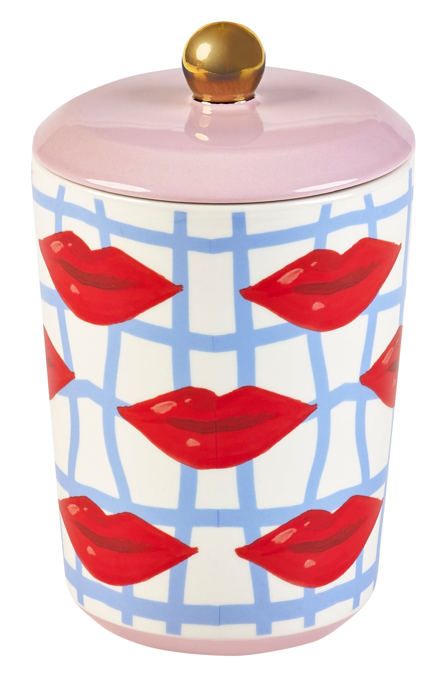 Brighten your space with the Eleanor Bowmer Electric Coast Lips Storage Jar, a statement piece that combines functionality with playful design. Crafted from durable stoneware, this jar features a bold blue checkered pattern adorned with hand-illustrated red lips, topped with a contrasting pink lid and finished with a gold foil handle for an extra touch of glamour.