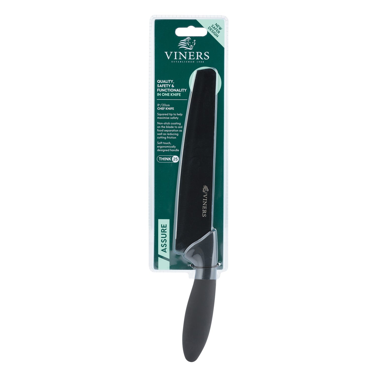 The Viners Assure 8″ Chef Knife is designed for both safety and high performance in home kitchens. Its unique squared-tip blade reduces the risk of accidental pokes while allowing you to carry out all standard chopping, slicing, and dicing tasks.