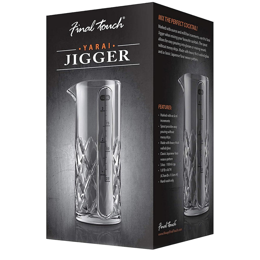 Craft your ideal cocktail with precision using the Yarai Jigger, featuring clearly marked ounce and milliliter measurements for accurate mixing. Its spout ensures drip-free pouring into glasses or mixing vessels, while its robust, thick-walled glass construction boasts the iconic Japanese Yarai weave-pattern. This jigger holds up to 3.4oz (100ml).