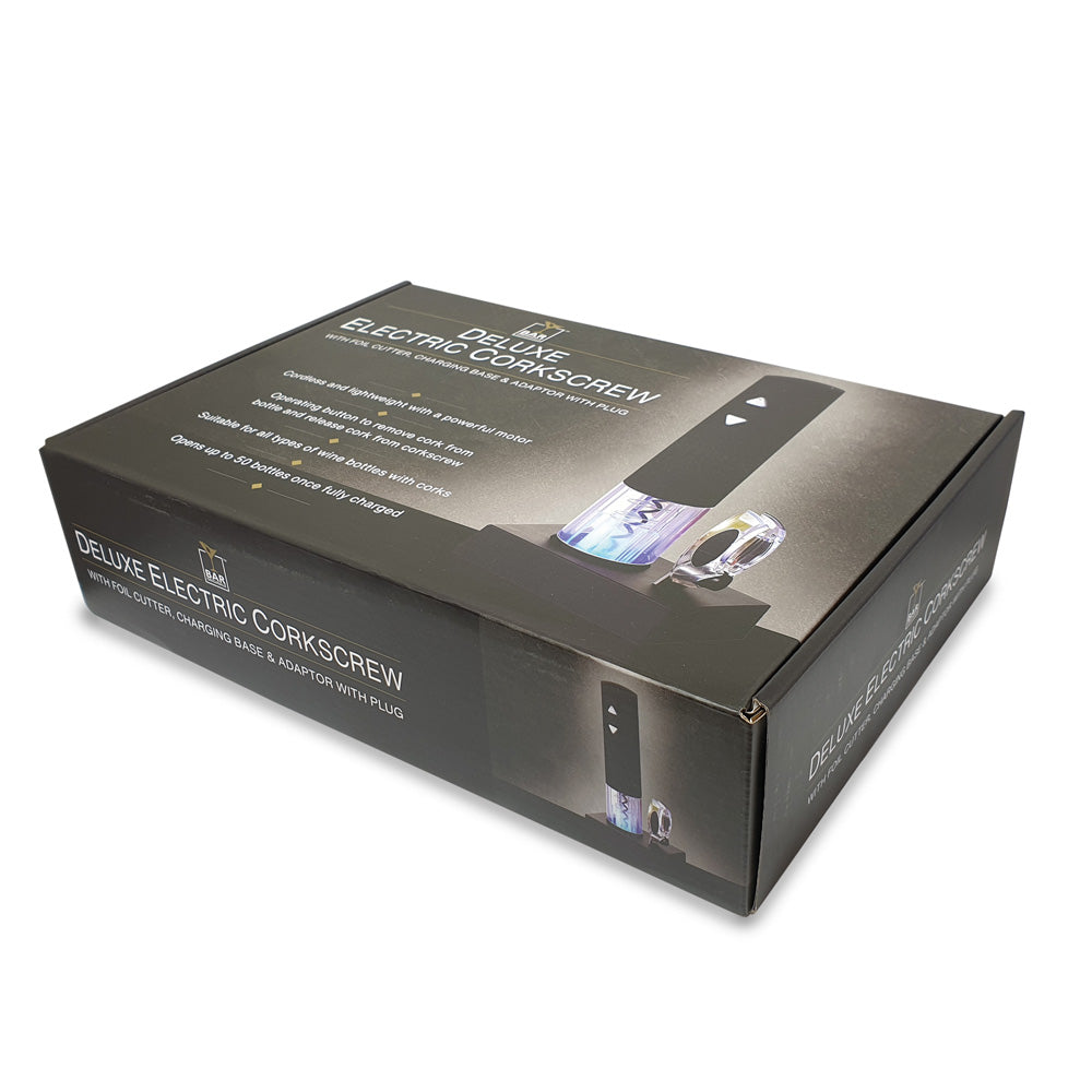 Our popular electric corkscrew is now available in the new Bar Originale design as part of our premium range of drink accessories. This efficient corkscrew can open up to 50 bottles on a single charge and includes a foil cutter, charging base with a choice of 2 or 3 pin plug. It removes corks in under ten seconds and works on all cork types and most bottles. The non-slip black coated body ensures a secure grip. Simply place the corkscrew on the bottle, press a button to drill into the cork, and it automatically removes it before shutting off. Press another button to release the cork effortlessly. Perfect for those with limited strength or busy sommeliers!