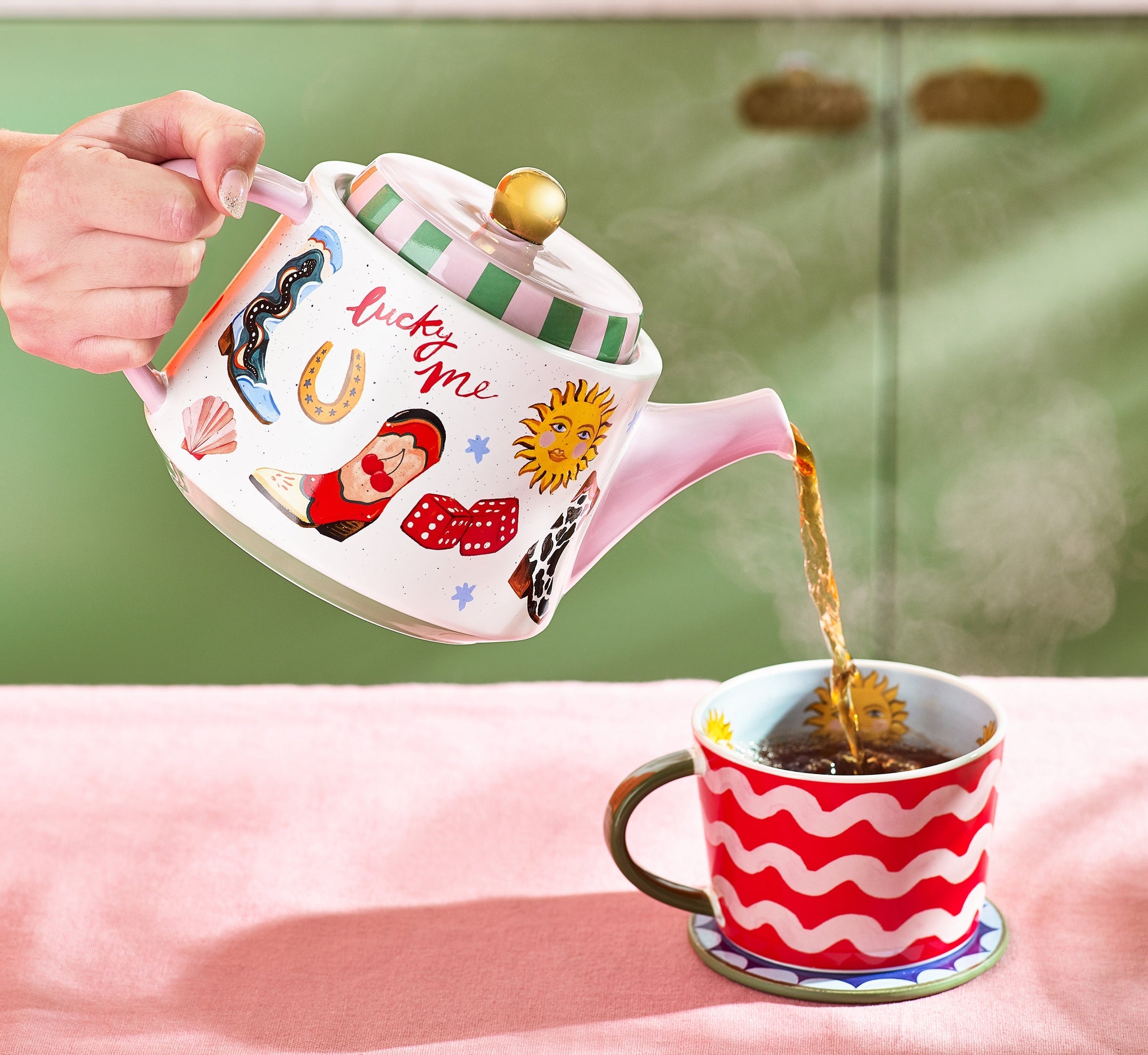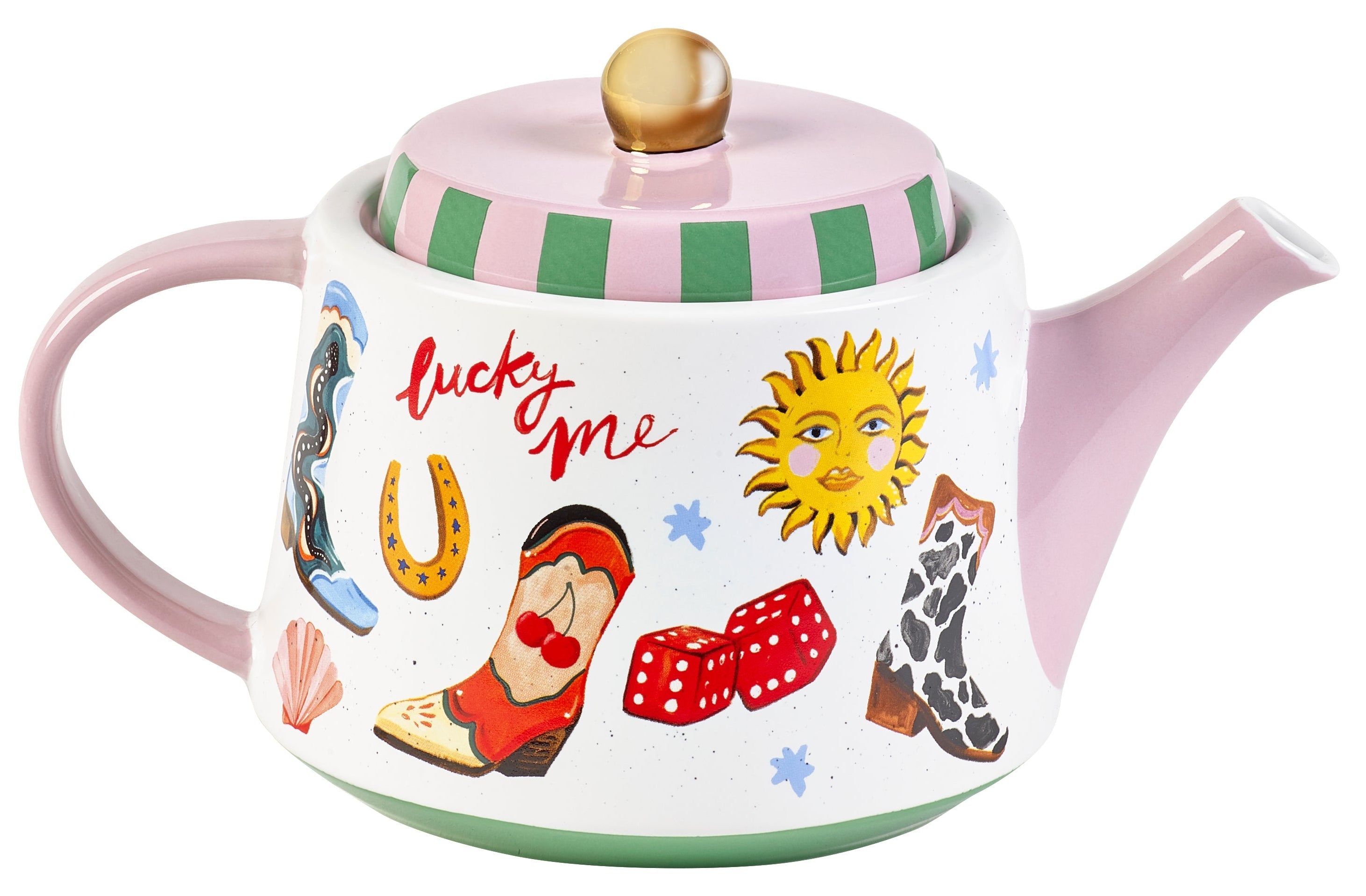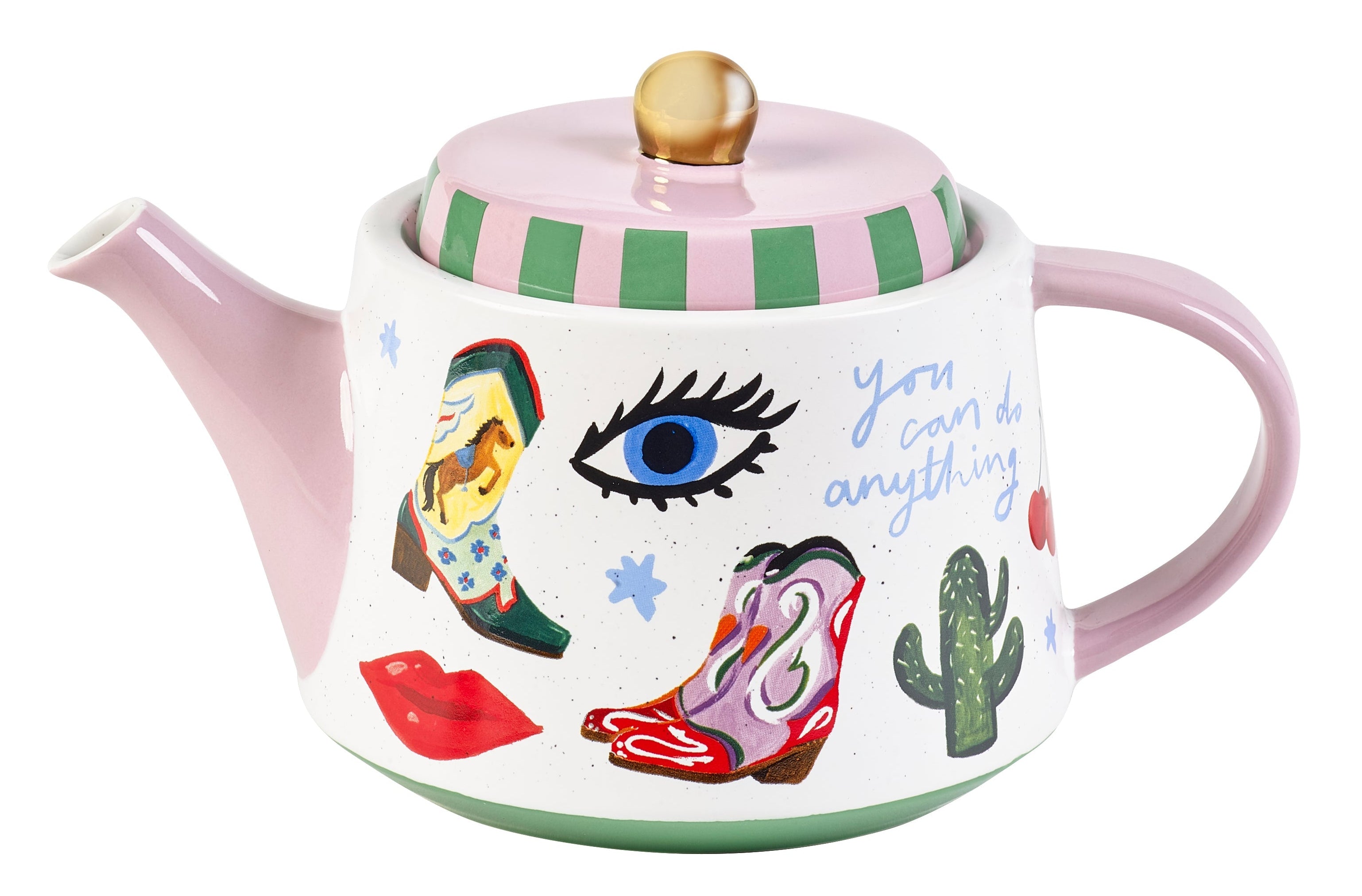 Brighten your tea time with the Eleanor Bowmer Electric Coast Teapot, a vibrant addition to the Electric Coast collection. Crafted from durable stoneware, this teapot showcases hand-illustrated desert-inspired icons, including cacti, cowboy boots, and blazing suns. The empowering message "You Can Do Anything" adds a touch of positivity to your kitchen. With a playful contrast striped lid, speckled glaze, and pink handle and spout, this teapot blends bold design with feel-good vibes.