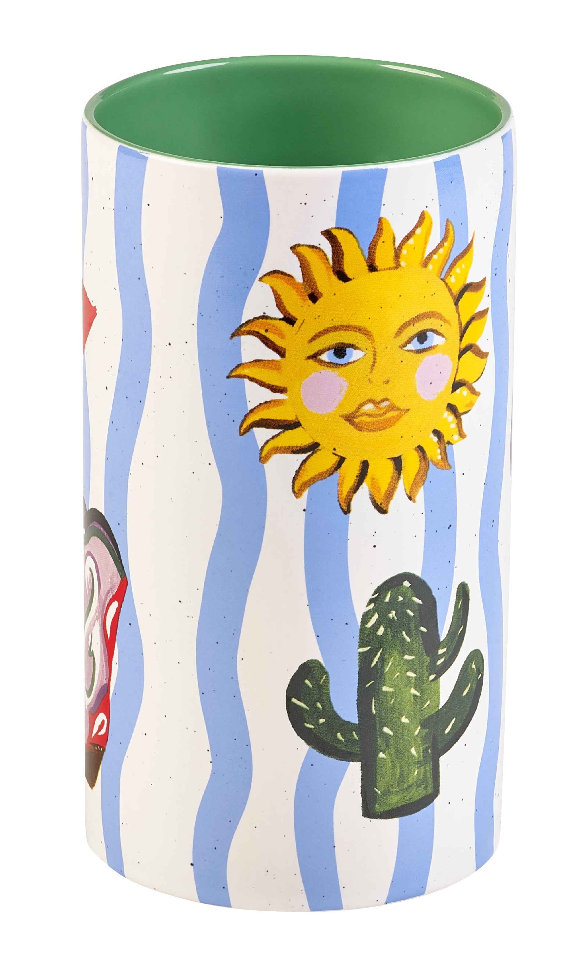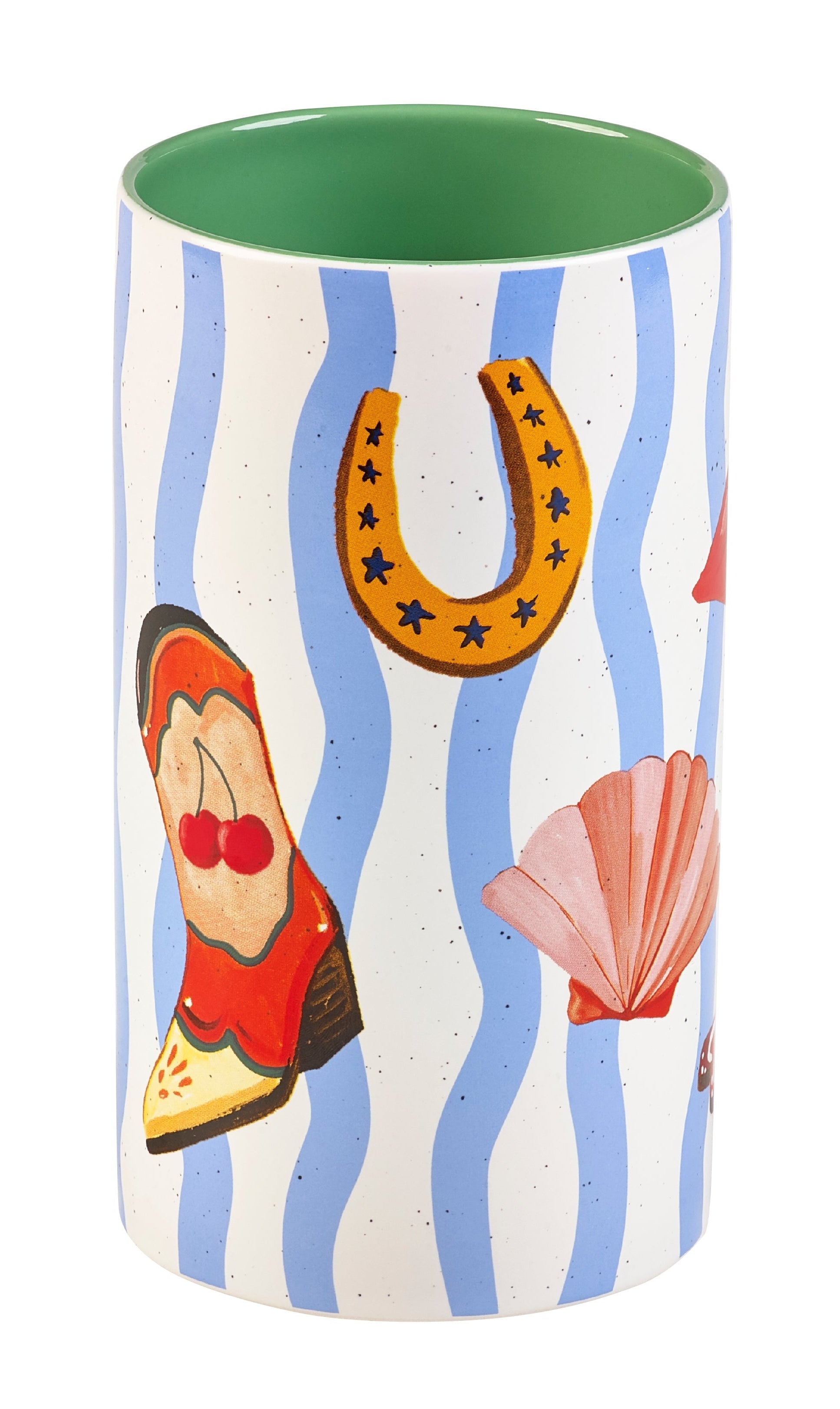 Brighten your kitchen with the Eleanor Bowmer Electric Coast Utensil Holder, a statement piece that combines functionality with playful design. Crafted from durable stoneware, this holder features hand-illustrated cowboy boots, lucky horseshoes, and sun-soaked shells, all set against a bold striped backdrop that brings major countertop charm.