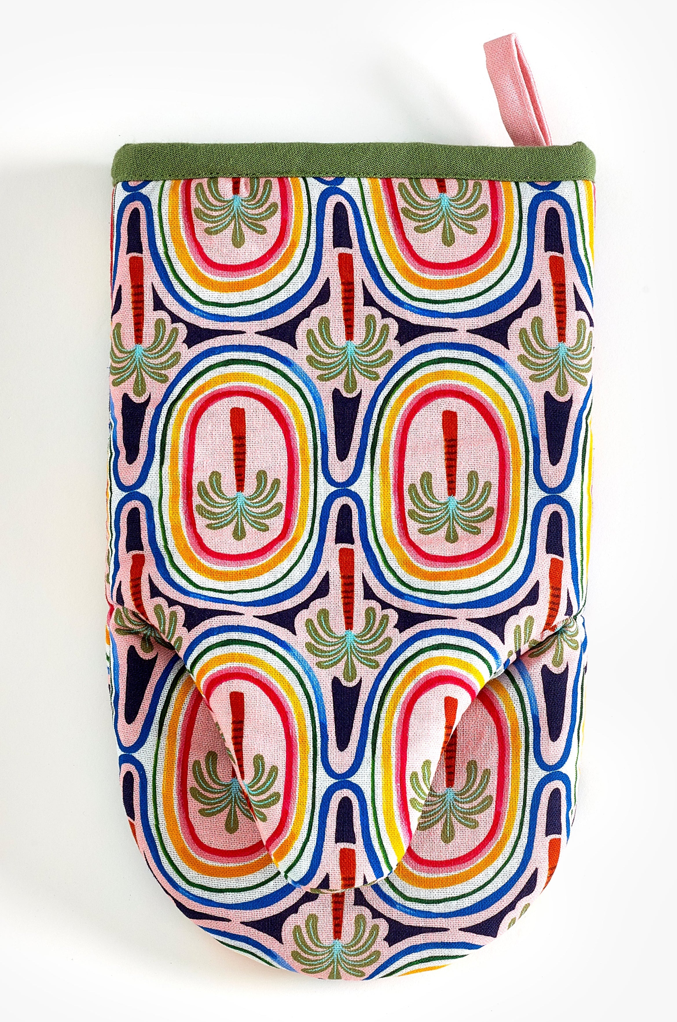 Add tropical flair to your kitchen with the Eleanor Bowmer Palm Tree Single Oven Glove from the Electric Coast collection. This stylish oven glove features a vivid pink and green palm tree motif that brings a summery, fun vibe to cooking and baking. Made from 100% cotton, it measures approximately 18 cm × 32 cm, delivering comfortable protection while handling hot pots and trays. A handy hanging loop makes it easy to store, keeping your kitchen organized. Machine washable on low temperature, it’s designed for regular use without fading its colours. Pair with matching tea towels and aprons for a coordinated look.