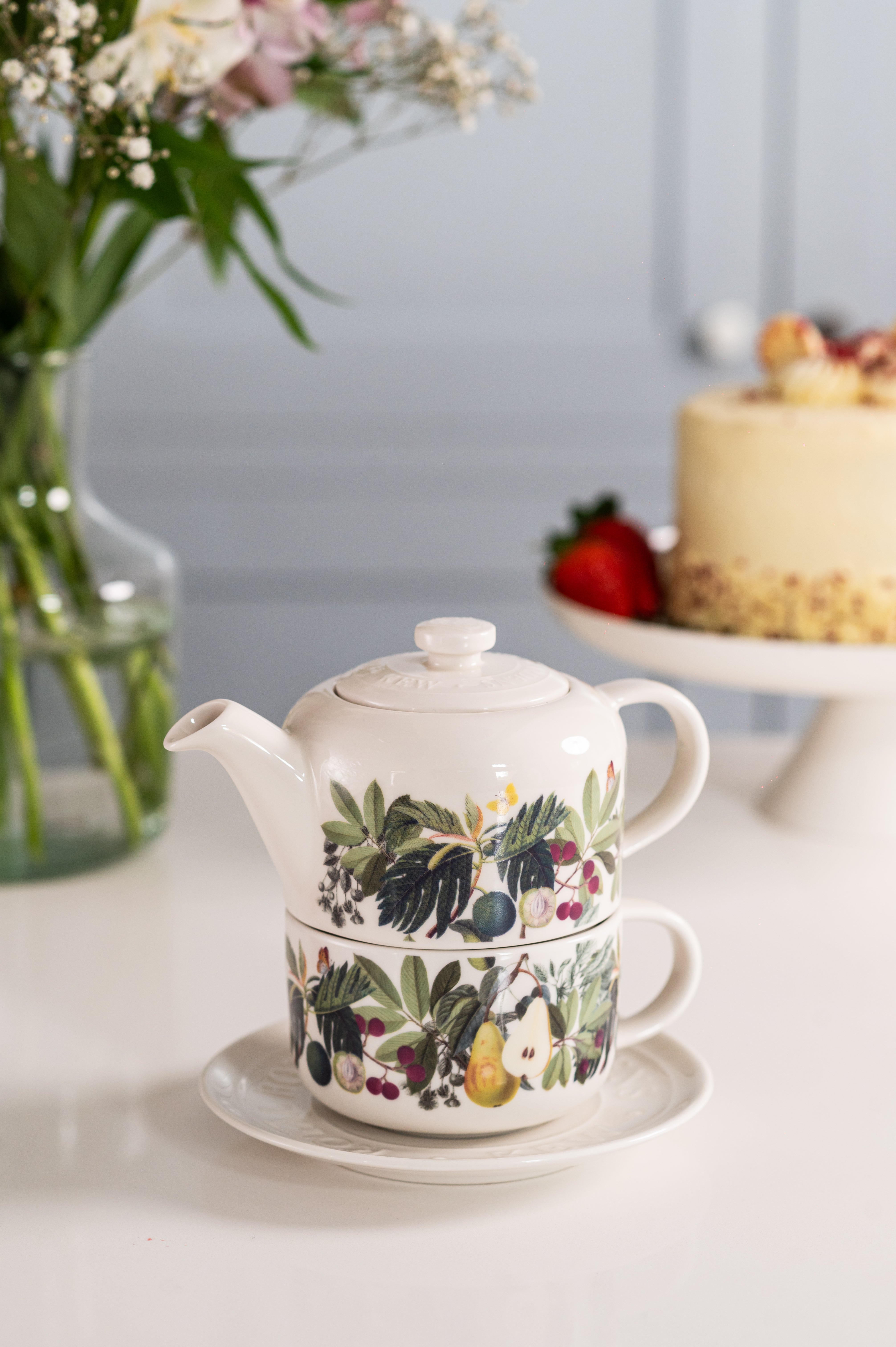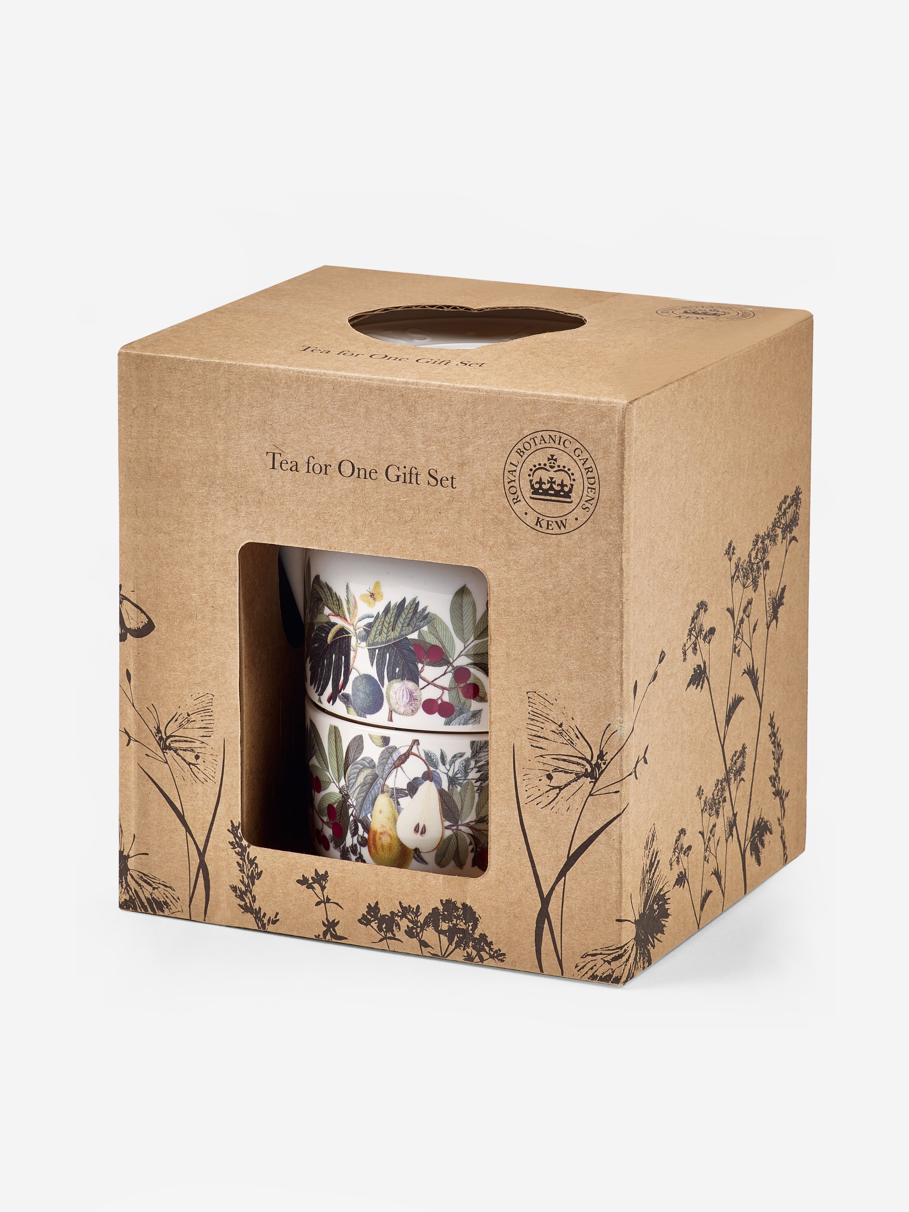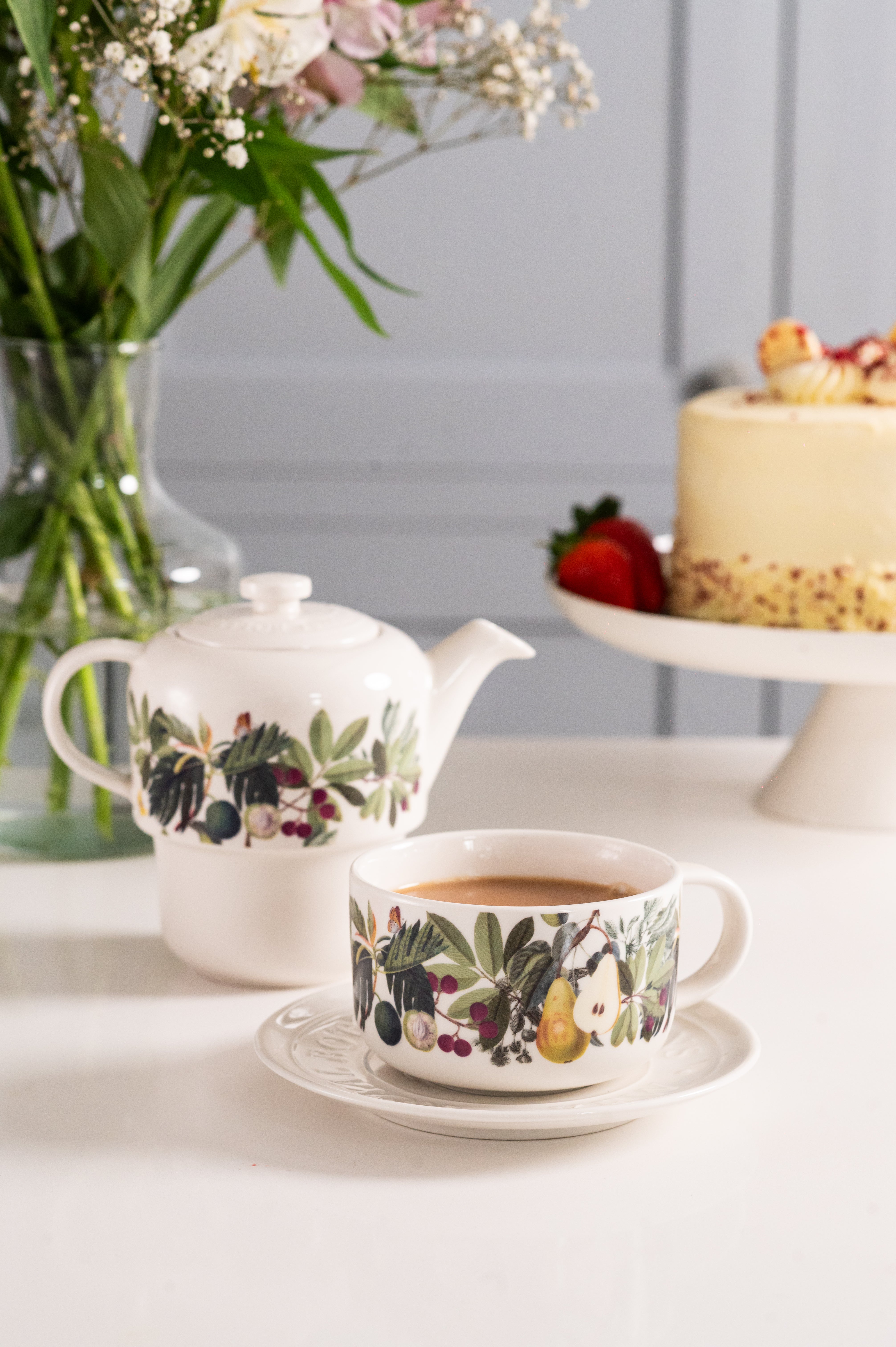 Indulge in a personal tea experience with the Kew Bloom Tea for One. Crafted from high-quality fine china, this set features intricate fruit and floral illustrations inspired by the historical archives of the Royal Botanic Gardens, Kew. The set includes a teapot, teacup, and saucer, all designed to nest together for compact storage. Dishwasher safe for easy maintenance, this tea set combines functionality with botanical elegance.