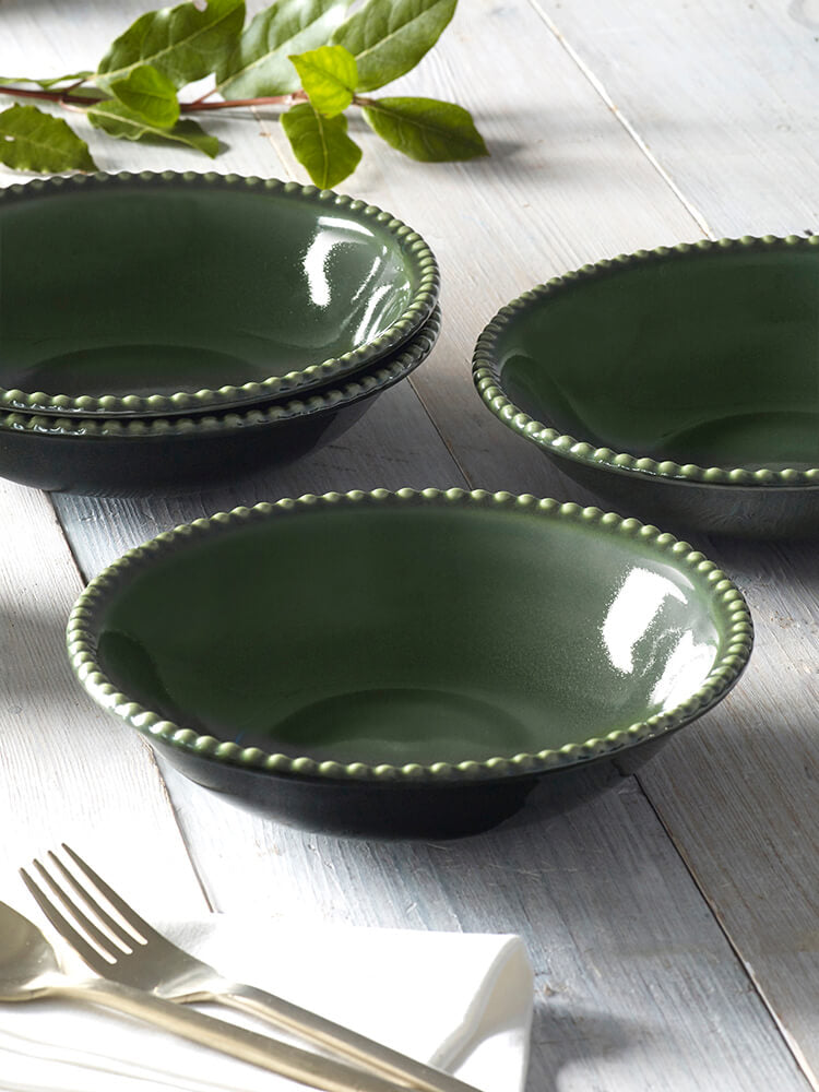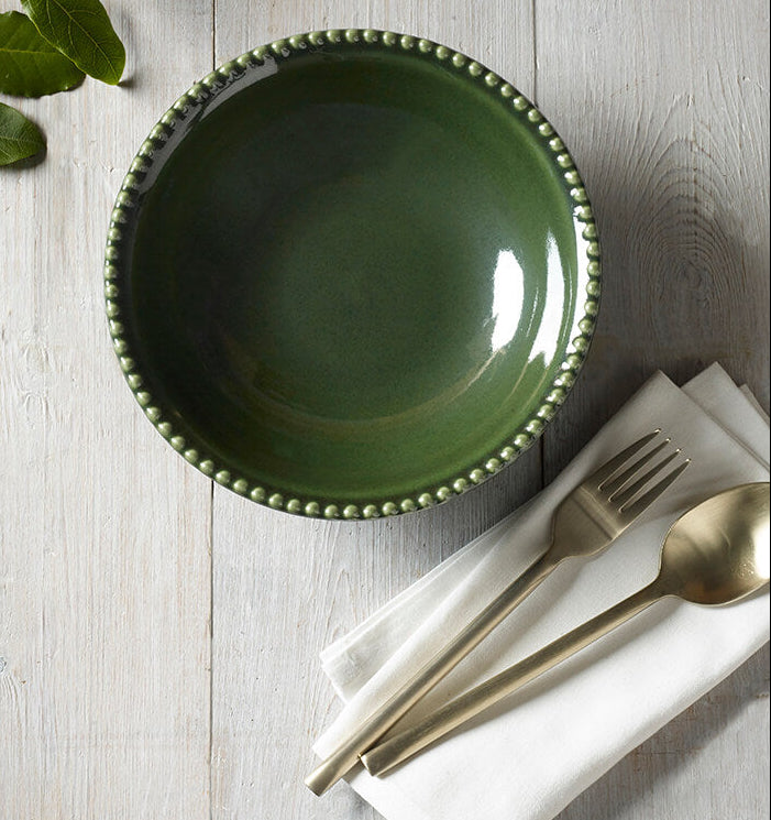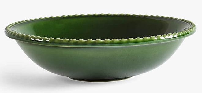 Enhance your table setting with the MM Living Green Bobble Pasta Bowl, a piece that combines elegance and functionality. Crafted from high-quality stoneware, this bowl boasts a rich, earthy green tone complemented by a beaded edge detailing. The smooth, glossy glaze adds a touch of sophistication, making it a versatile addition to any dining occasion.