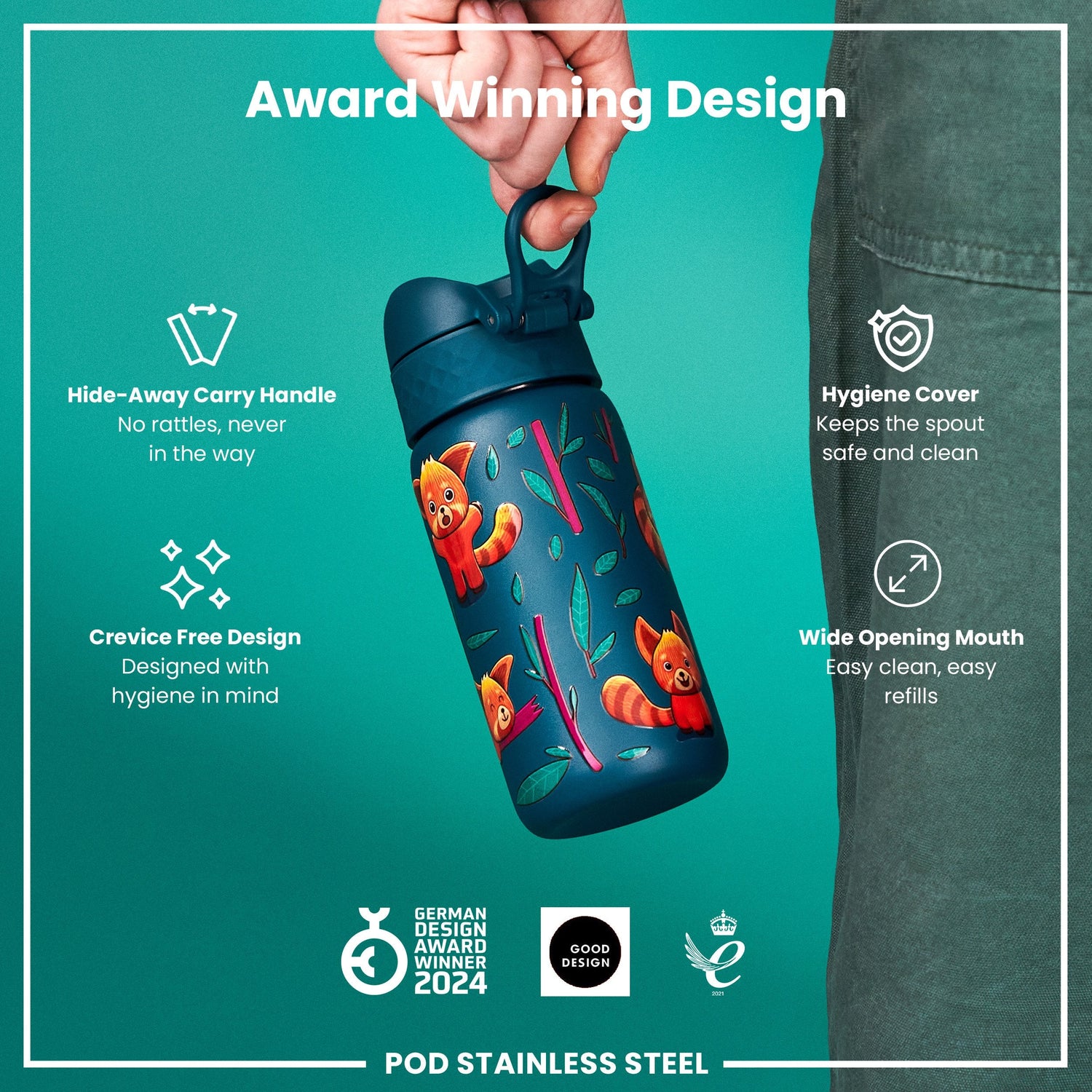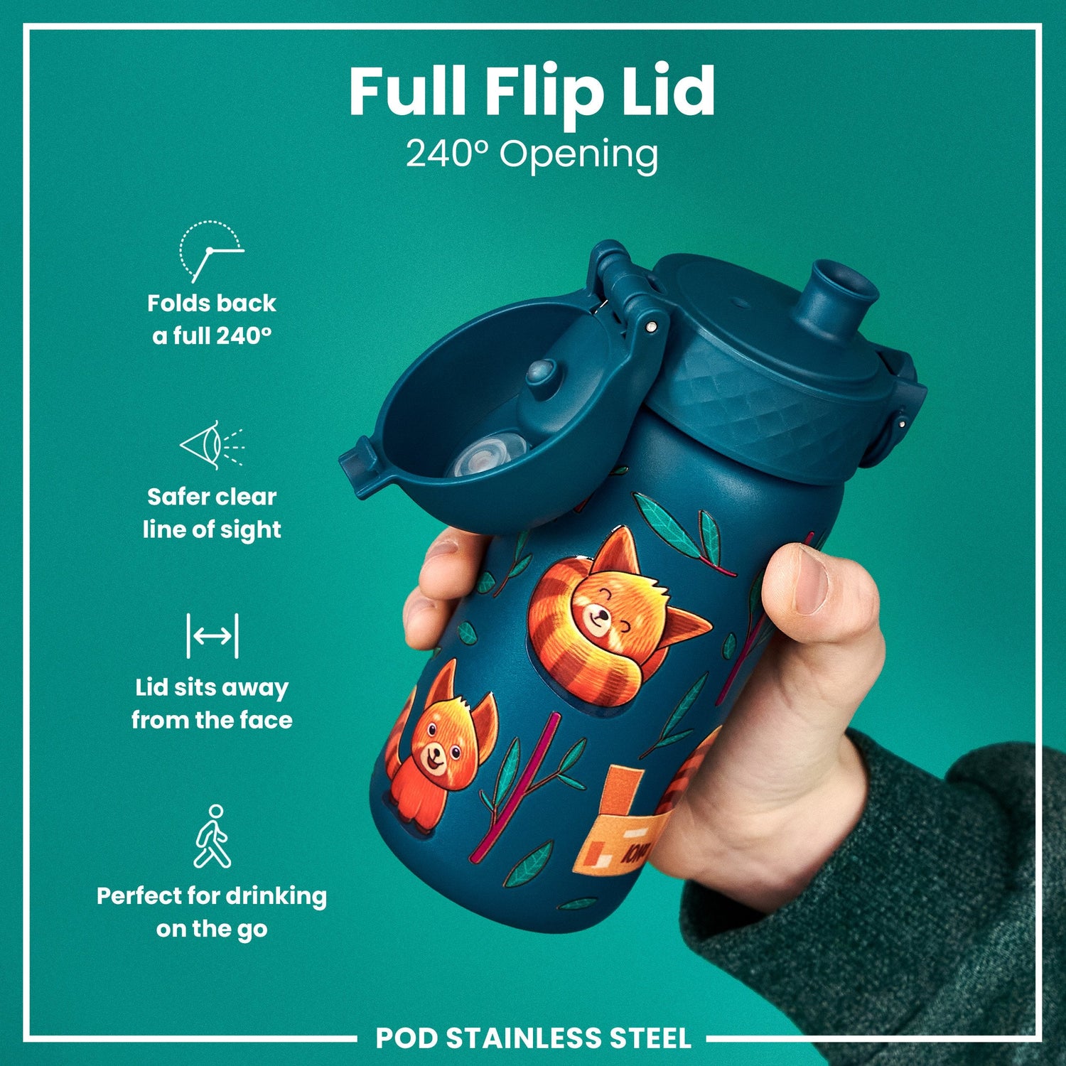ION8 Leak Proof Kids Water Bottle, Stainless Steel, Red Pandas, 400ml (13oz)