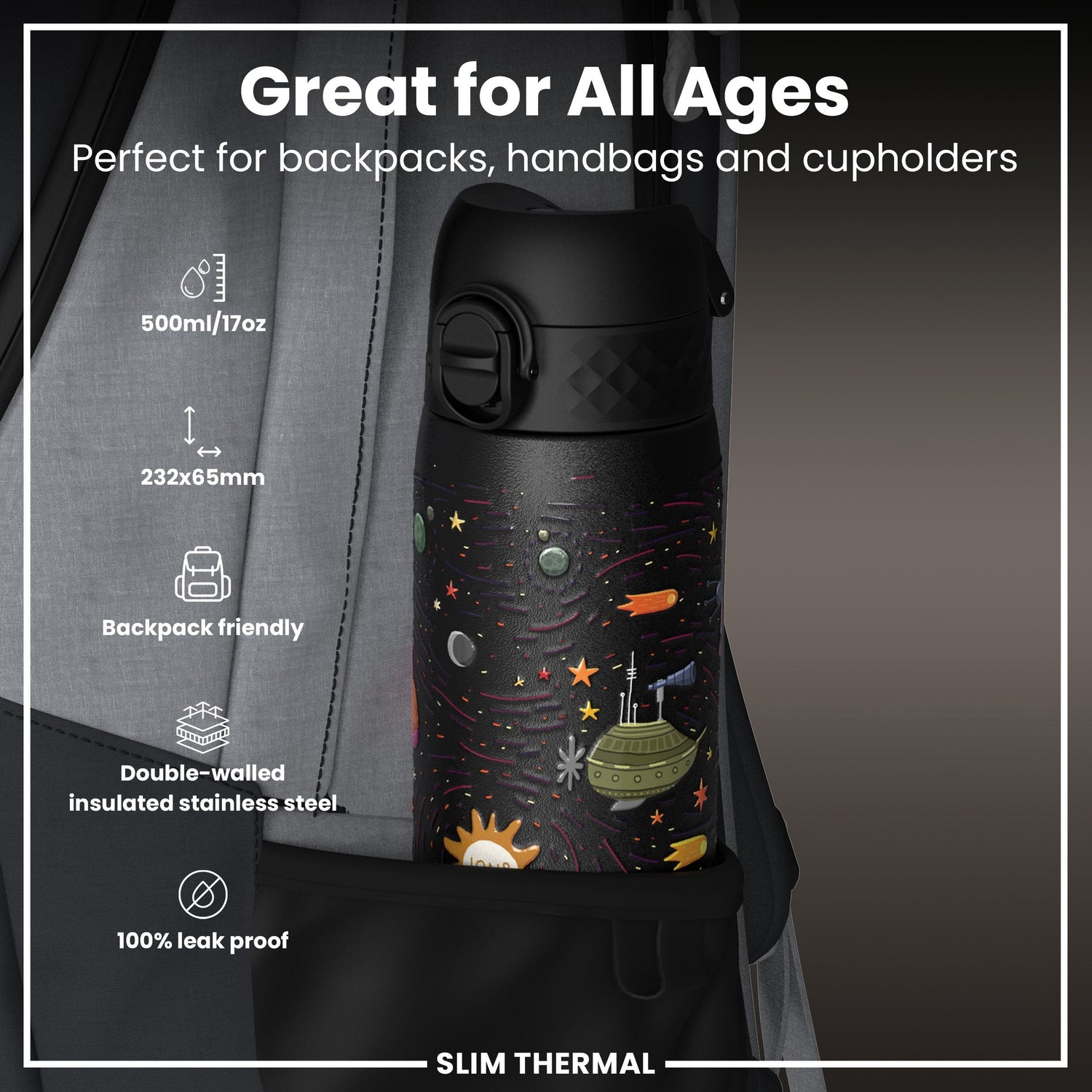 ION8 Leak Proof Slim Thermal Water Bottle, Insulated Steel, Spaceships, 500ml (17oz)