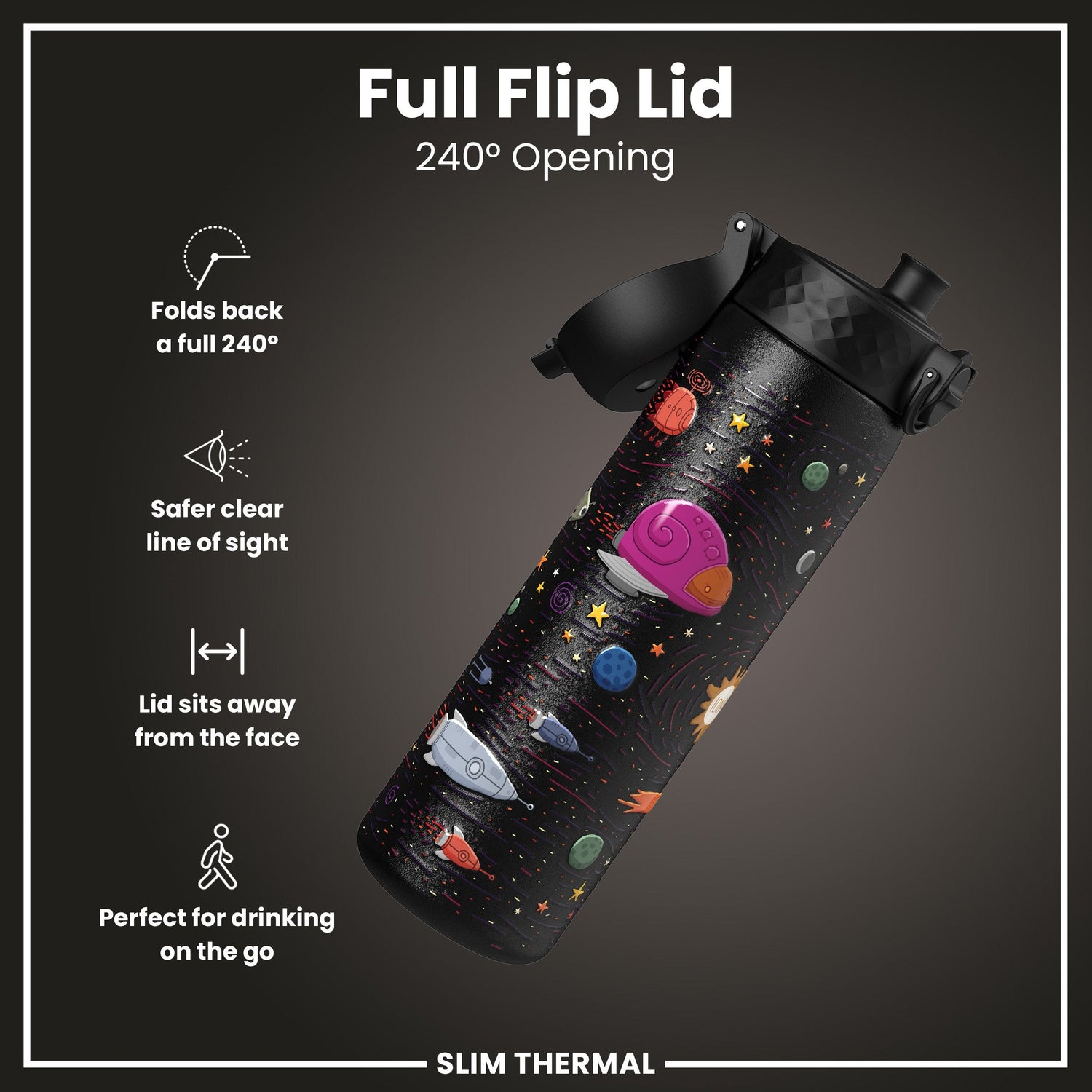 Blast off into hydration with the Ion8 Leak-Proof Slim Thermal Water Bottle – Spaceships Design (500ml / 17oz). Designed for both kids and adults, this bottle combines functionality with a playful space-themed motif.