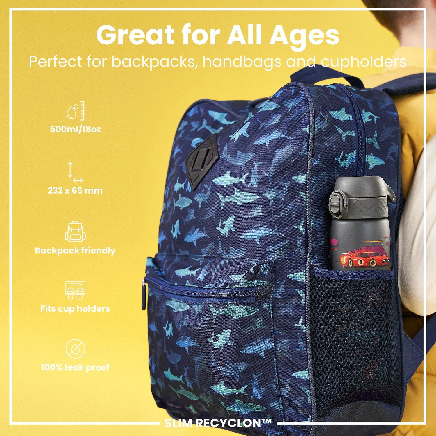 Make hydration fun and eco-friendly with the ION8 Leak-Proof Slim Water Bottle – Recyclon™ Sport Cars, 500 ml (18 oz). This compact bottle is perfect for school, outings, or travel. The vibrant sport cars design adds a playful touch, while the leak-proof feature ensures no spills in bags or lunch boxes. Made from Recyclon™, a carbon-neutral plastic partly derived from plants, this bottle is not only durable but also eco-friendly. It's BPA-free, odor-resistant, and dishwasher-safe, making it easy to clean and maintain. With a capacity of 500 ml, it's the ideal size for young children, fitting comfortably in small hands and most cup holders.