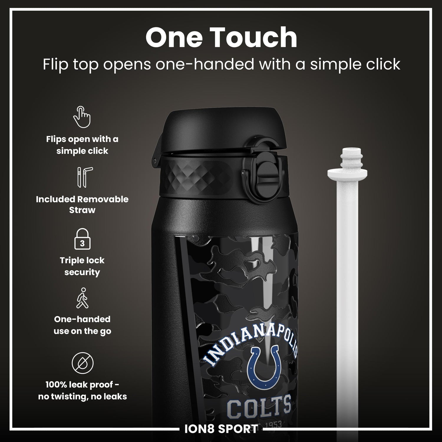 With a capacity of 750ml (24oz), it's ideal for staying refreshed during workouts, commutes, or game days. The sleek design showcases the Indianapolis Colts logo, making it a must-have accessory for any fan.