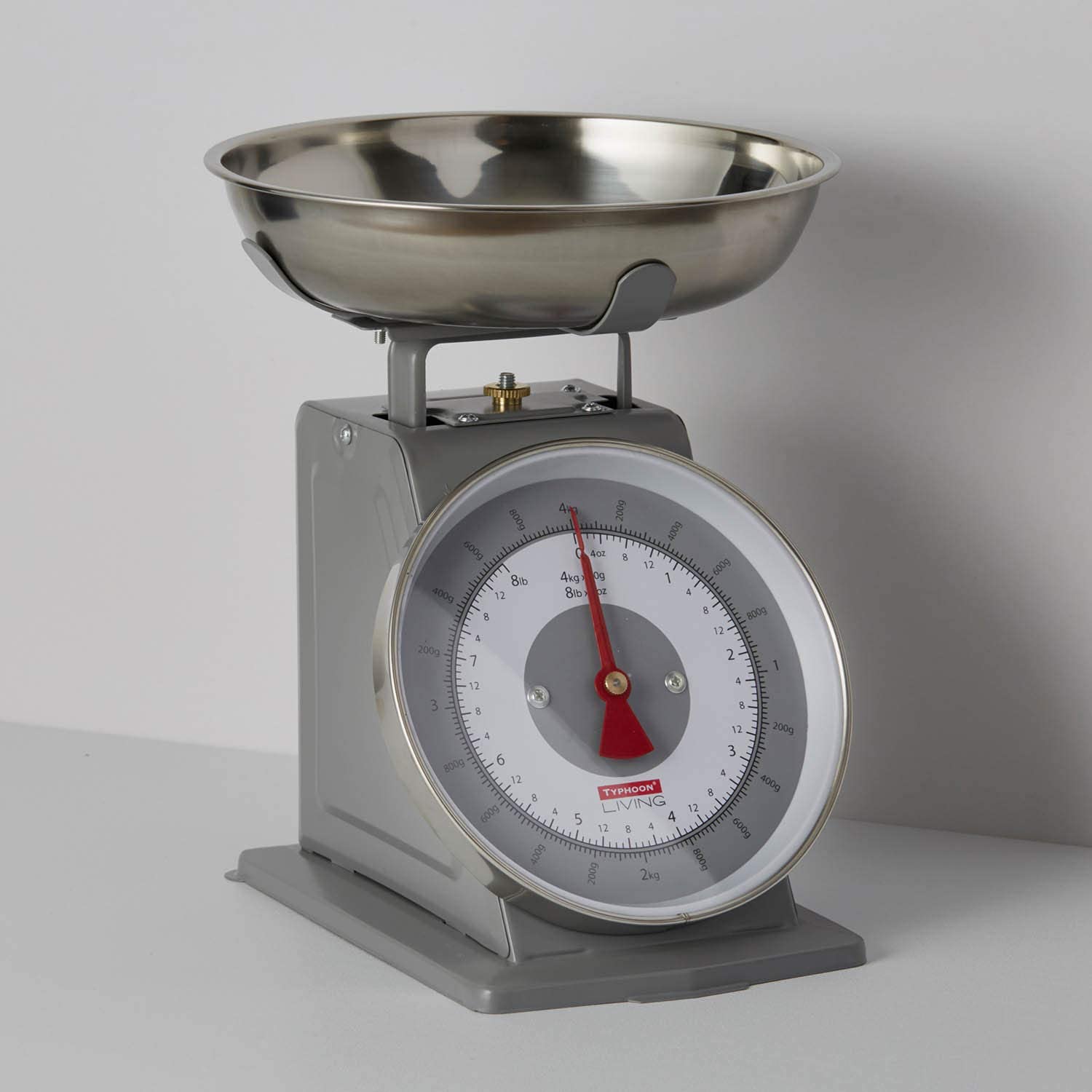Add vintage elegance and precision to your kitchen with the Typhoon Living Grey Mechanical Kitchen Scale. Featuring a retro-style pitch-gray coated steel body, this scale delivers accurate measurements up to 4 kg (8 lb) in both metric and imperial units. The stainless steel bowl is generously sized for versatile use and easily removed for cleaning. A clear, easy-read dial with a contrasting red hand provides immediate visibility and precision, while the compact footprint (approximately 25 × 15.5 × 25 cm) ensures it fits neatly on your countertop.