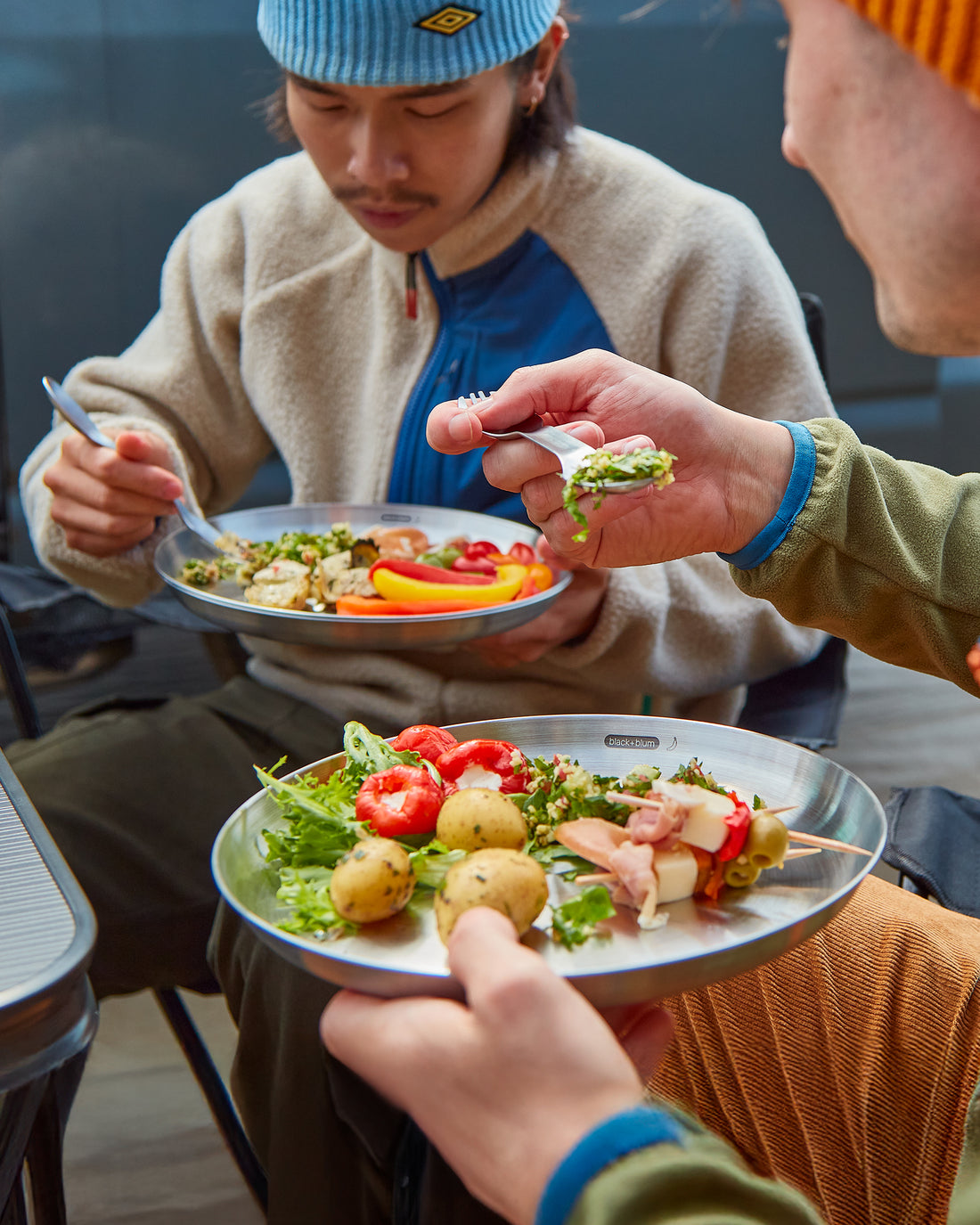 Professional-grade picnic plates crafted in stainless steel with bamboo lids, combining practicality and elegance in a lightweight, nestable set.