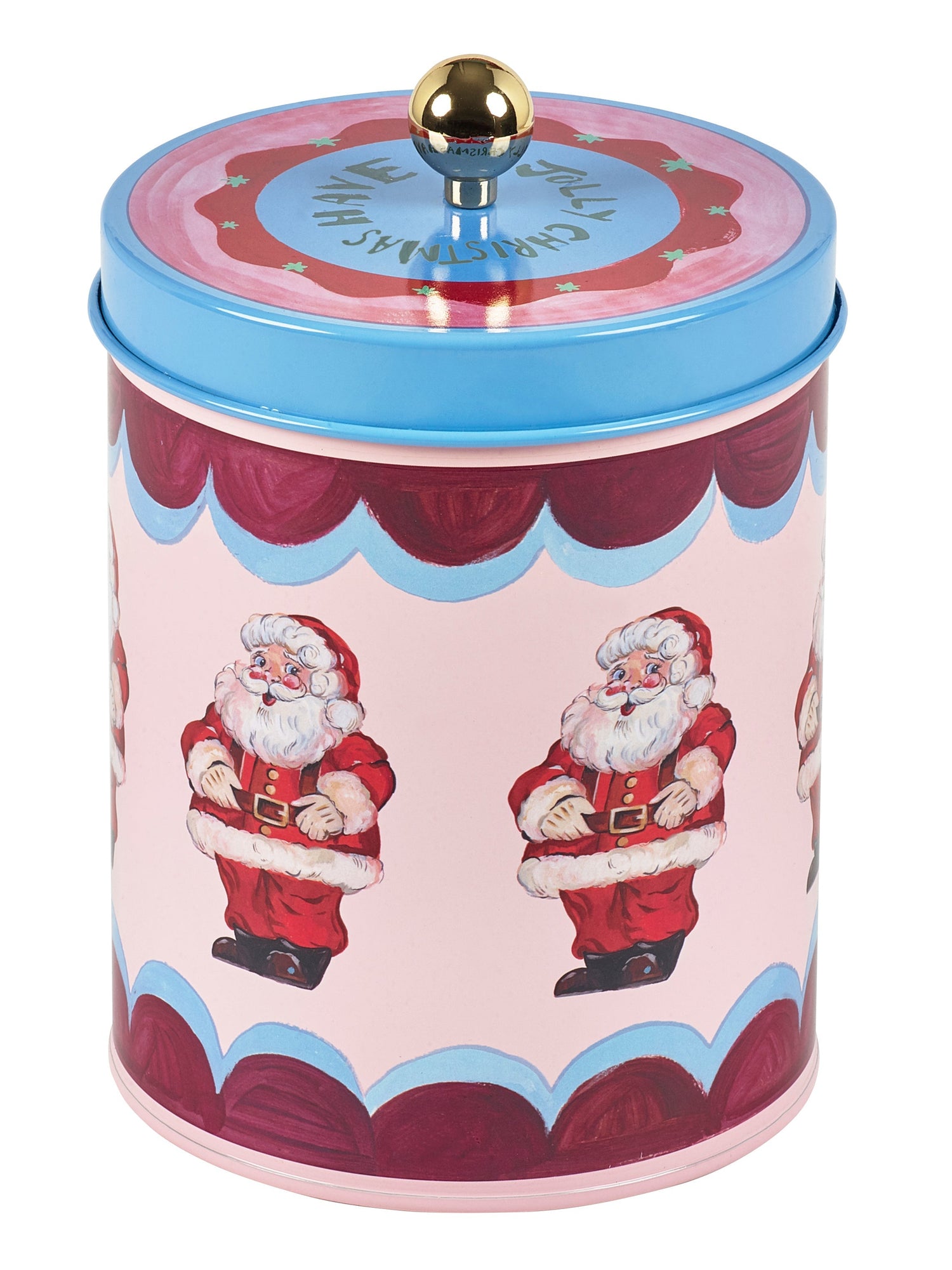 Celebrate the season with the Eleanor Bowmer Fabulously Festive Biscuit Tin. This charming round tin features a soft pink body adorned with repeating jolly Santa illustrations, nestled within a playful scalloped border. The baby blue lid is decorated with festive gold text, all topped off with a luxurious gold ball handle, making it a truly joyful addition to your kitchen counter.