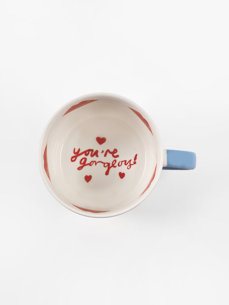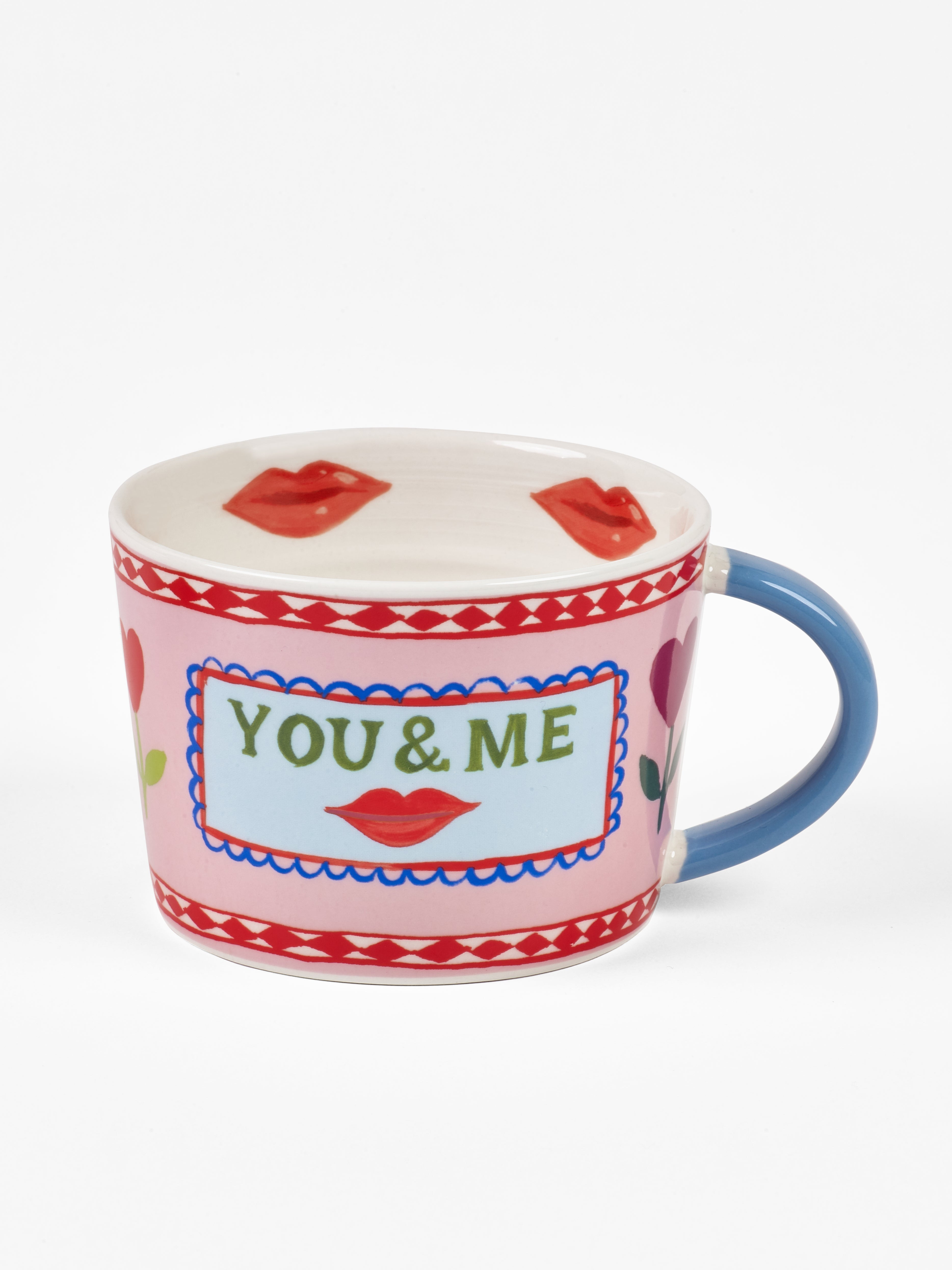 The Eleanor Bowmer 'With Love' Set of 2 Mugs adds a cheerful touch to your daily routine. Crafted from durable stoneware, each 330ml mug showcases hand-drawn romantic illustrations in a playful stamp-style design. Contrasting handles in red and blue provide a bold pop of color, while the 'You & Me' slogans add a sweet sentiment. Perfect for sharing a cuppa with someone special, these mugs are both dishwasher and microwave safe for convenience.
