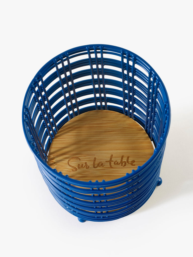 Add a splash of color to your kitchen with the Sur La Table Blue Wire Utensil Pot. Designed to keep your cooking utensils organized and within easy reach, this utensil holder combines functionality with style. Crafted from vibrant royal blue wire, it features a spun bamboo base etched with the Sur La Table logo, adding a touch of elegance to your countertop. The open wire design allows for optimal air circulation, helping to keep your utensils dry and ready for use.
