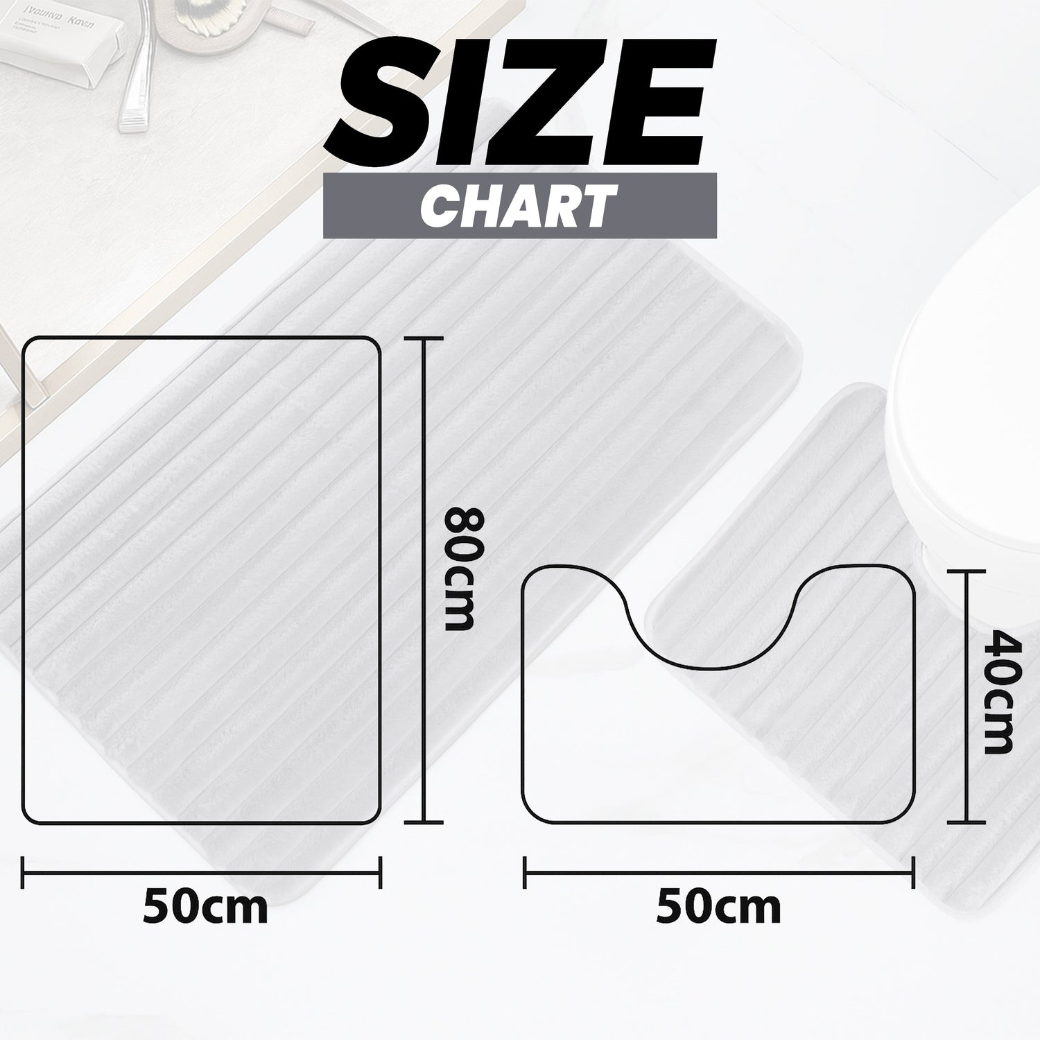 This set includes two perfectly sized mats: one bath mat ideal for placement outside your shower or tub, and one smaller toilet mat that fits snugly around the base of your toilet. Both are generously sized to cover high-traffic areas and provide ample coverage for bathroom comfort.