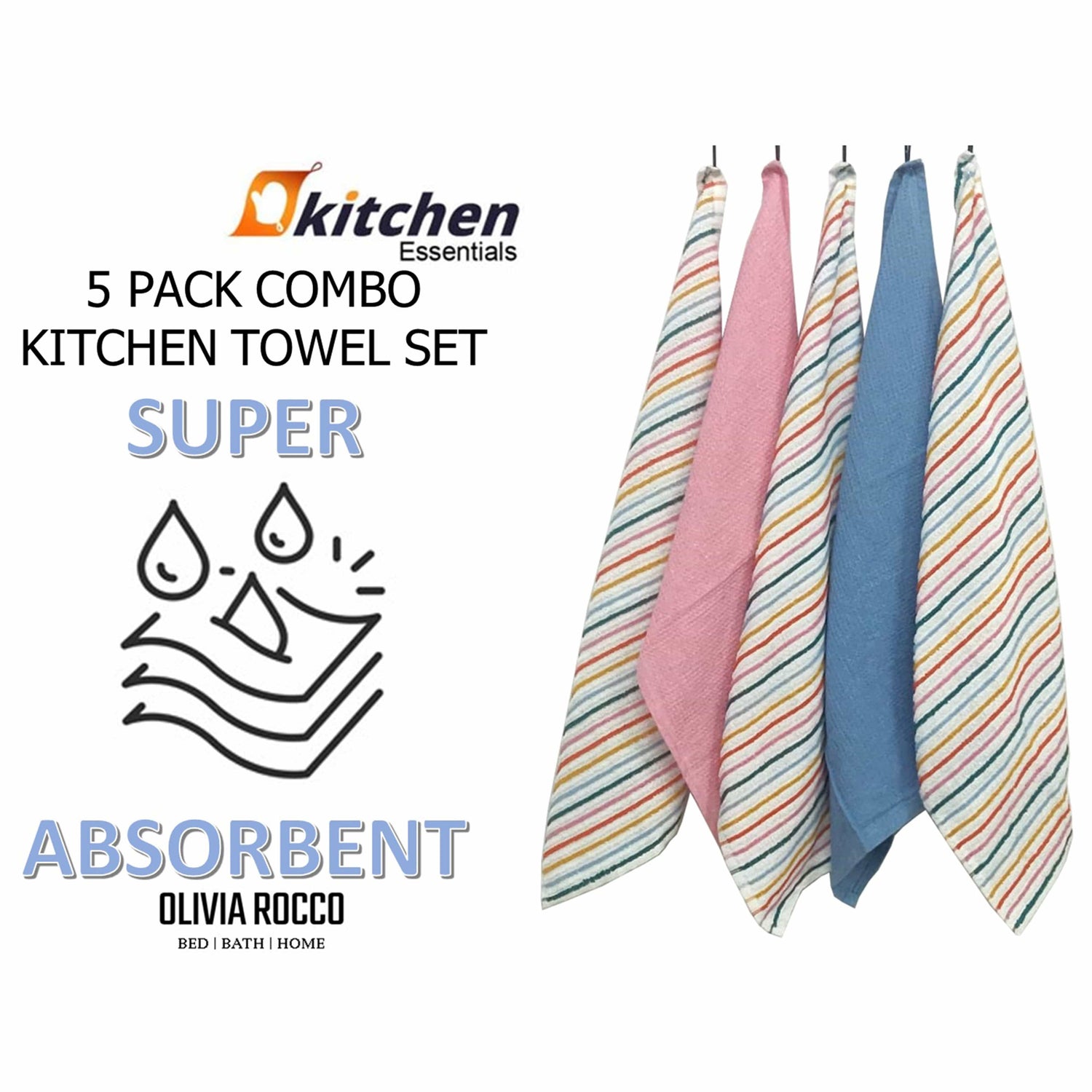 5 Pack Super Absorbent Cotton Kitchen Tea Towels by OLIVIA ROCCO - 45cm x 65cm