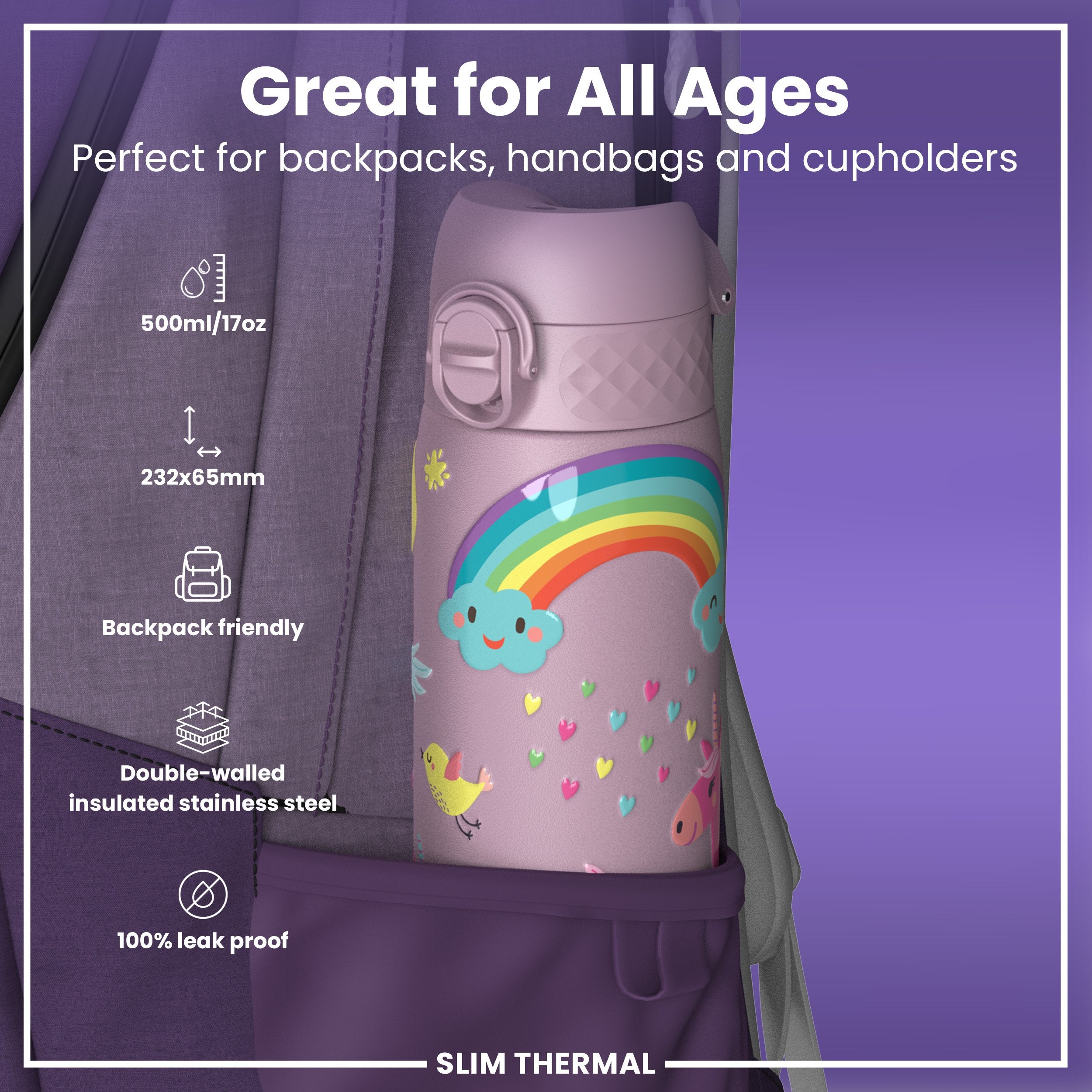 With a capacity of 500ml (17oz), it's ideal for staying refreshed during workouts, commutes, or daily activities. The slim profile fits comfortably in most cup holders and backpack pockets, making it a convenient choice for all ages.