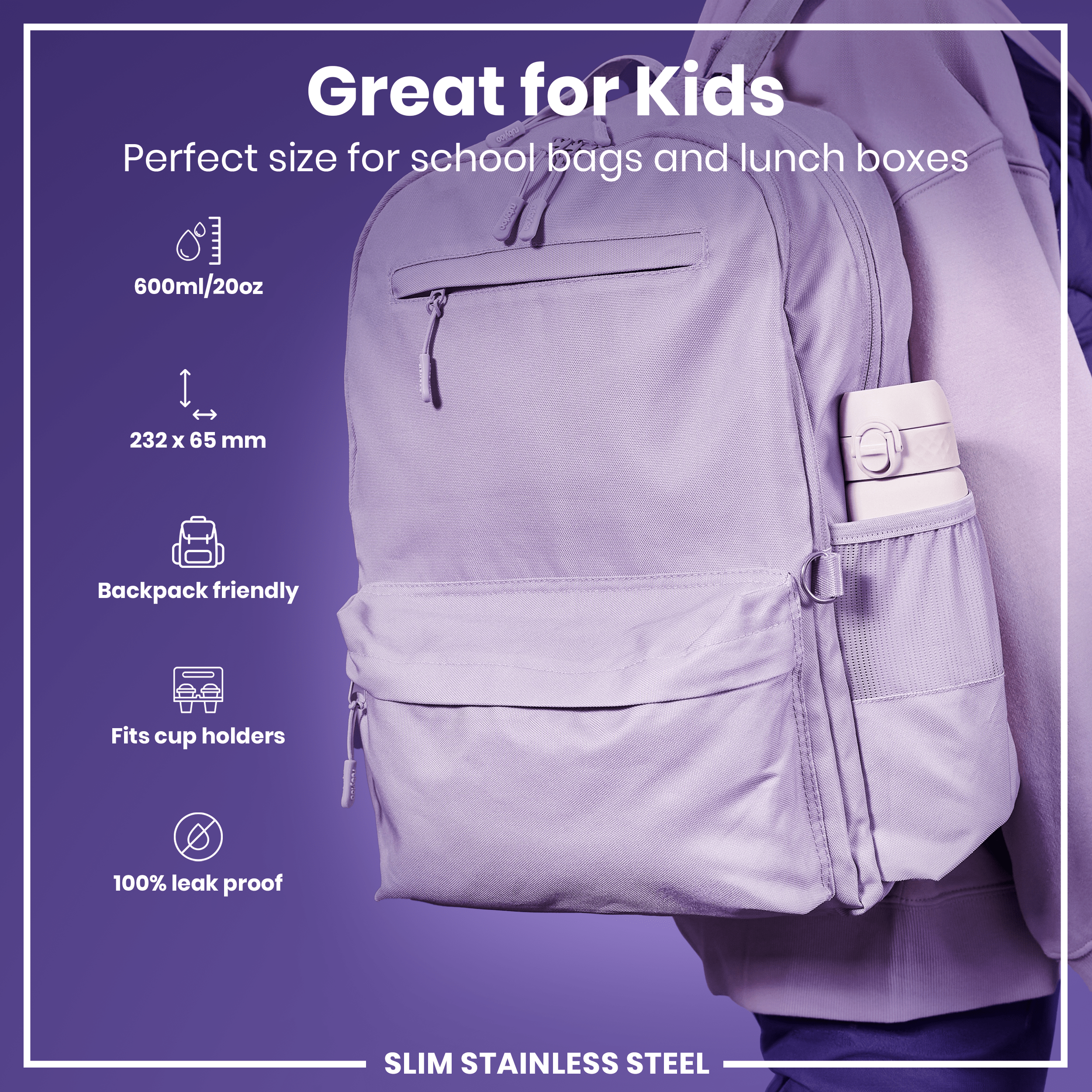 The 600ml capacity ensures you have ample hydration throughout the day, while the elegant lilac dusk color adds a touch of sophistication to your routine. The leak-proof design guarantees no spills, making it perfect for tossing into your gym bag, backpack, or car cup holder.