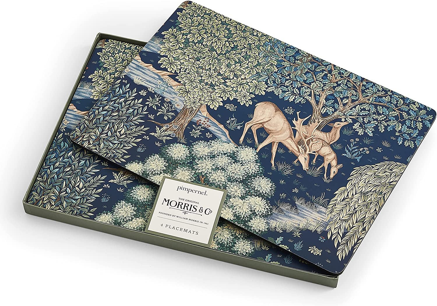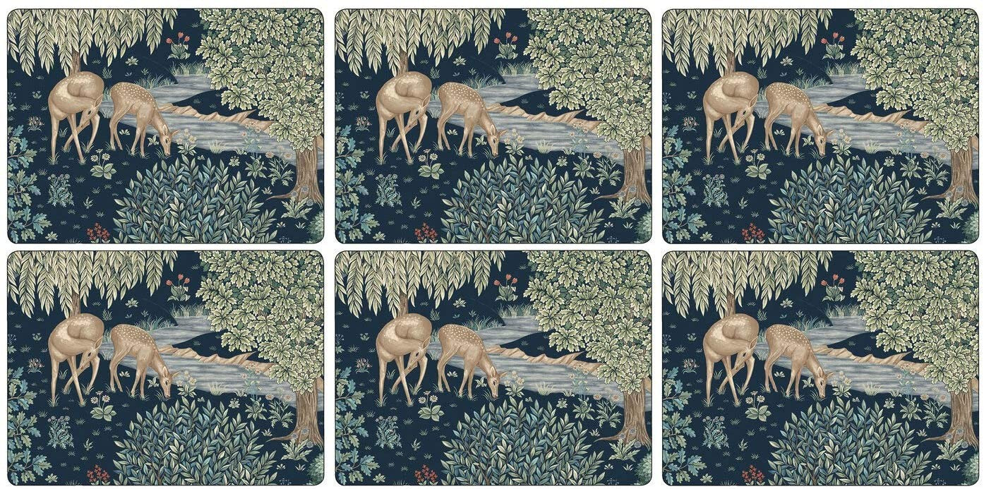 Invite the beautiful woodland to your table with this set of six placemats. Perfect for hosting dinner for a large family or group of friends, these placemats will be talk of the table. Featuring a stunning Morris and Co. archive design of striking deers in a magnificent woodland scene, these coasters will not only keep your tabletop free from marks and spills, but will also impress your guests. Pair with Pimpernel's Morris and Co. Wightwick coasters for a truly wonderful experience.