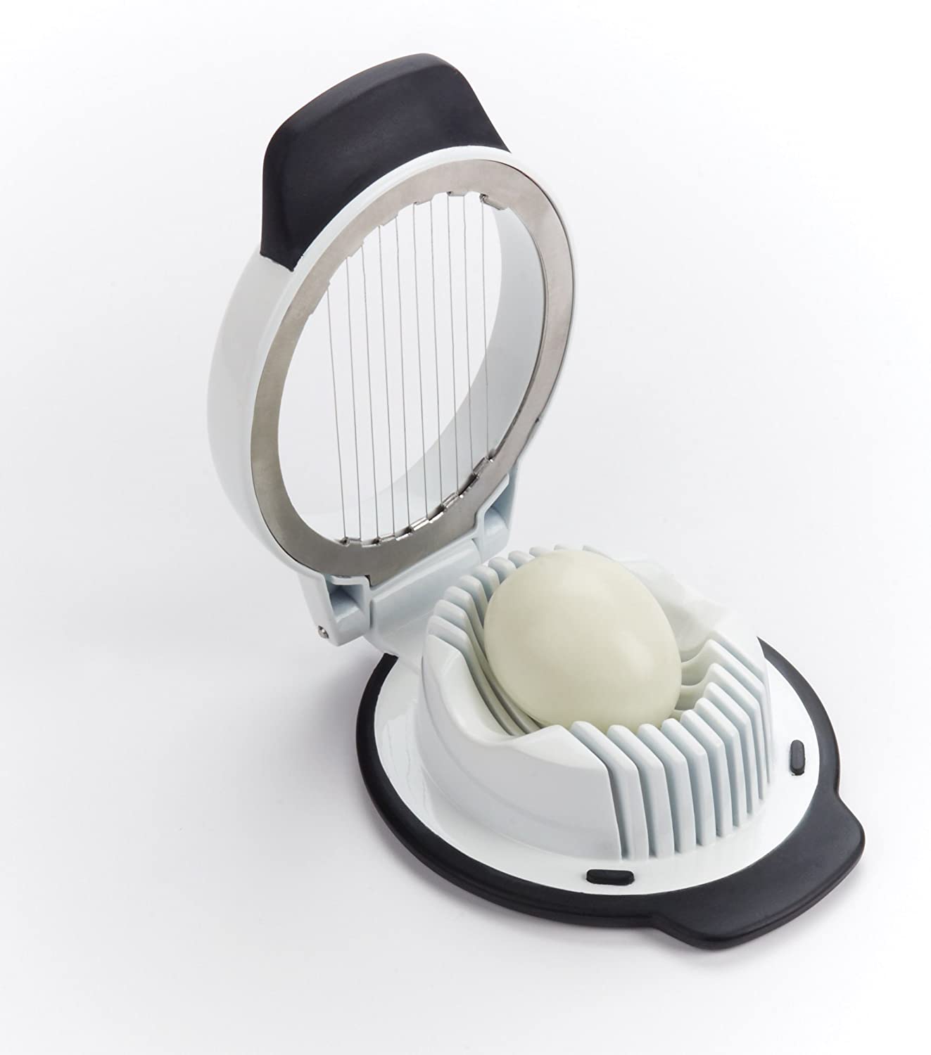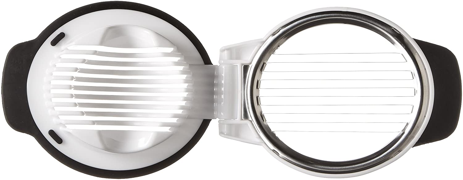 The OXO Good Grips Egg Slicer yields perfect 5 mm slices with one simple press. The holder cradles the egg in two directions, giving you the option of round or oblong slices. The raised handle is easy to open and close, and the non-slip base provides a comfortable grip while slicing over bowls or plates.
